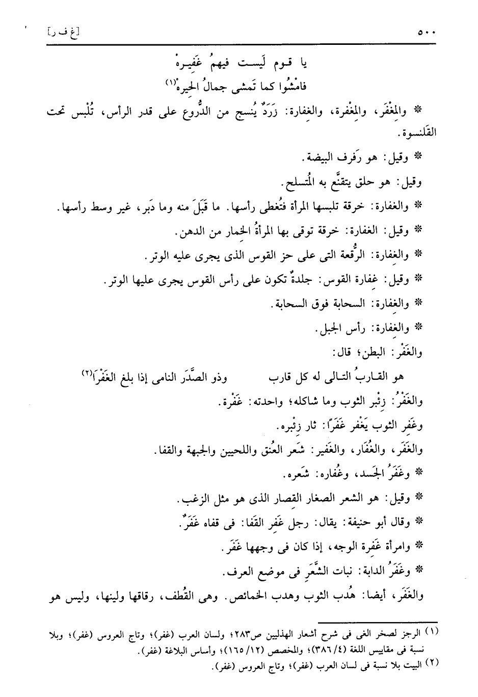 وغَفَرُ الدَّابَّة: نَبَات الشَّعَرِ فِي مَوضِع الْعرف. والغَفَر أَيْضا: هدب الثَّوْب وهدب الخمائص. وَهِي القطف، رقاقها ولينها، وَلَيْسَ هُوَ