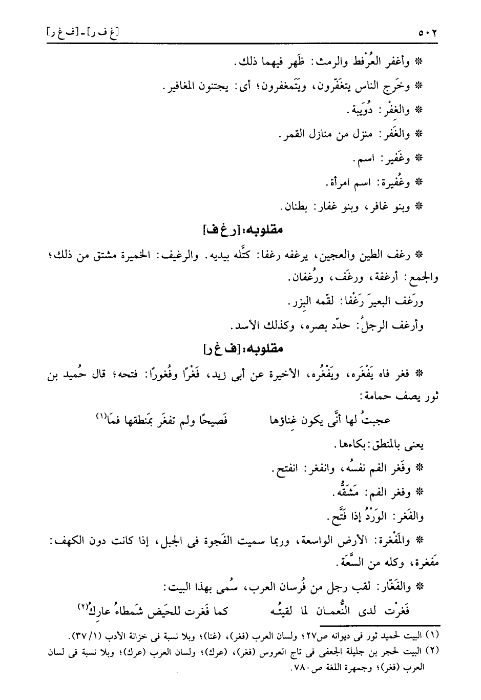 فغر فَاه يَفْغَره، ويَغْفَره، الْأَخِيرَة عَن أبي زيد، فَغْراً وفُغوراً: فَتحه، قَالَ حُميد بن ثَوْر يصف حمامة: