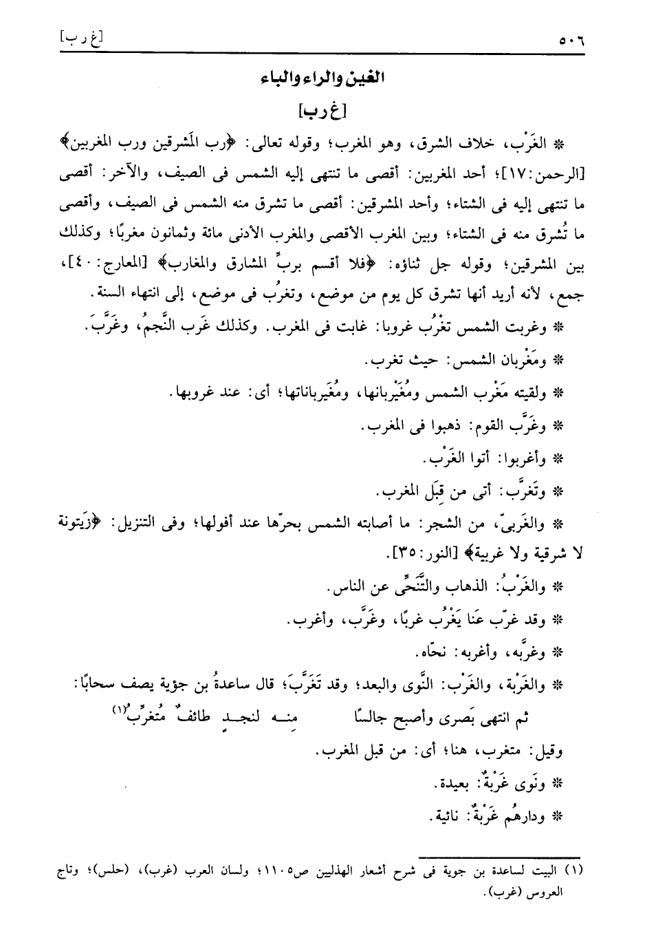 الغَرْب، خلاف الشرق، وَهُوَ الْمغرب، وَقَوله تَعَالَى: (رب المَشرقين وَرب المغربين) ، أحد المغربين: اقصى مَا تَنْتَهِي إِلَيْهِ الشَّمْس فِي الصَّيف، وَالْآخر: اقصى مَا تَنْتَهِي إِلَيْهِ فِي الشتَاء، وَأحد المشرقين: أقْصَى مَا تشرق مِنْهُ الشَّمْس فِي الصَّيف، وأقصى مَا تشرق مِنْهُ الشتَاء، وَبَين الْمغرب الْأَقْصَى وَالْمغْرب الْأَدْنَى مائَة وَثَمَانُونَ مغربا، وَكَذَلِكَ بَين المشرقين، وَقَوله جلّ ثَنَاؤُهُ: (فَلَا اقْسمْ بربّ الْمَشَارِق والمغارب) ، جمع، لِأَنَّهُ أُرِيد أَنَّهَا تشرق كل يَوْم من مَوضِع، وتغرُب فِي مَوضِع، إِلَى انْتِهَاء السّنة.