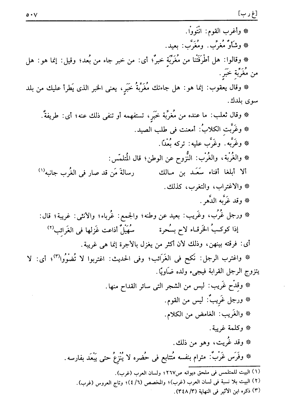 والغُرْبة، والغُرْب: النُّزوح عَن الوطن، قَالَ المُتلمّس: