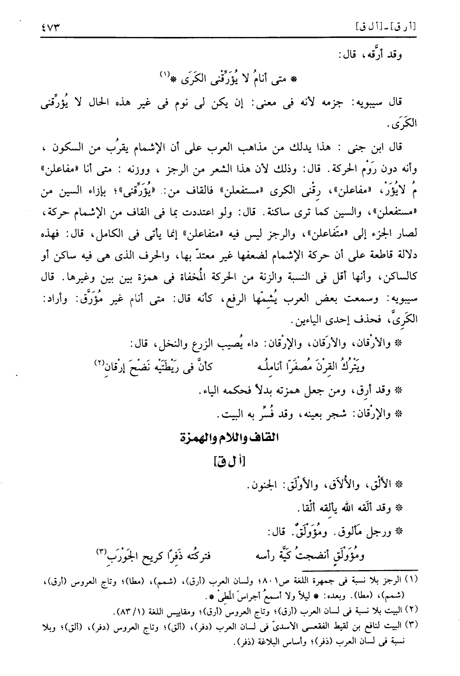 قَالَ ابْن جني: هَذَا يدلك من مَذَاهِب الْعَرَب على أَن الإشمام يقرب من السّكُون، وَأَنه دون روم الْحَرَكَة. قَالَ: وَذَلِكَ لِأَن هَذَا الشّعْر من الرجز، ووزنه: مَتى أَنا " مفاعلن " مُ لَا يؤر، " مفاعلن "، رقني الْكرَى " مستفعلن " فالقاف من " يؤرقني "، بِإِزَاءِ السِّين من " مستفعلن "، وَالسِّين كَمَا ترى سَاكِنة. قَالَ: وَلَو اعتددت بِمَا فِي الْقَاف من الإشمام حَرَكَة، لصار الْجُزْء إِلَى " متفاعلن "، وَالرجز لَيْسَ فِيهِ " متفاعلن " إِنَّمَا يَأْتِي فِي الْكَامِل، قَالَ: فَهَذِهِ دلَالَة قَاطِعَة على أَن كرحة الإشمام لِضعْفِهَا غير مُعْتَد بهَا، والحرف الَّذِي هِيَ فِيهِ سَاكن أَو كالساكن، وَأَنَّهَا اقل فِي النِّسْبَة والزنة من الْحَرَكَة المخفاة فِي همزَة بَين بَين وَغَيرهَا. قَالَ سِيبَوَيْهٍ: وَسمعت بعض الْعَرَب يشملها الرّفْع، كَأَنَّهُ قَالَ: مَتى أَنا غير مؤرق: وَأَرَادَ: الْكرَى، فَحذف إِحْدَى الياءين.