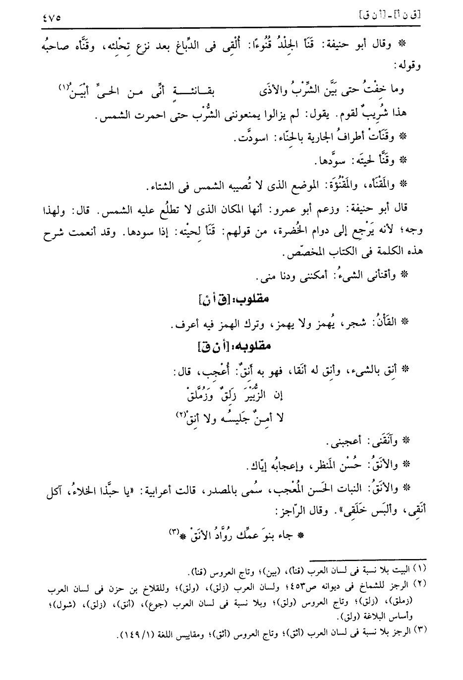 قَالَ أَبُو حنيفَة: وَزعم أَبُو عَمْرو: أَنَّهَا الْمَكَان الَّذِي لَا تطلع عَلَيْهِ الشَّمْس. قَالَ: وَلِهَذَا وَجه، لِأَنَّهُ يرجع إِلَى دوَام الخضرة، من قَوْلهم: قنأ لحيته: إِذا سودها. وَقد انعمت شرح هَذِه الْكَلِمَة فِي الْكتاب الْمُخَصّص.