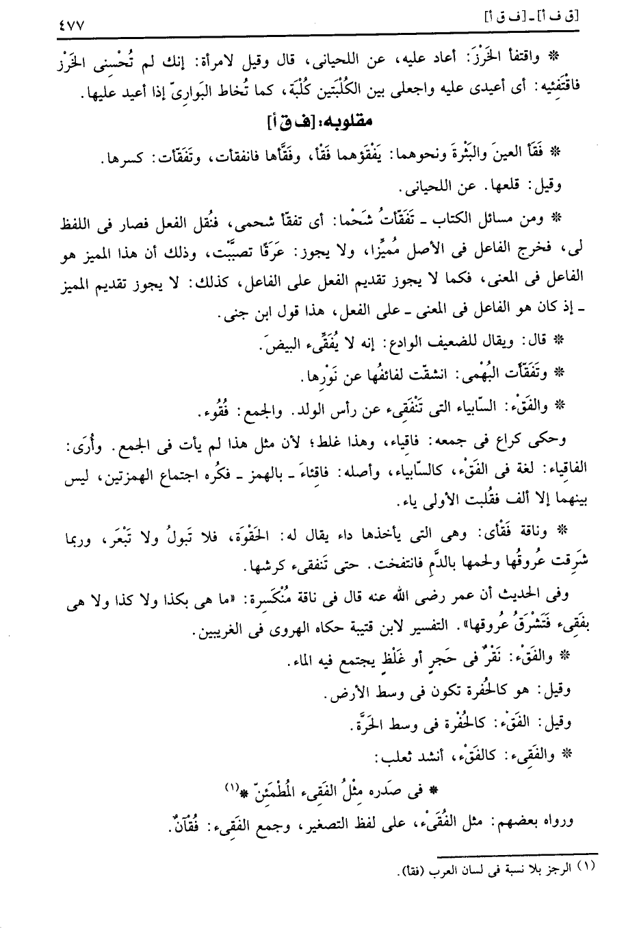 وَحكى كرَاع فِي جمعه: فاقياء، وَهَذَا غلط، لِأَن مثل هَذَا لم يَأْتِ فِي الْجمع. وَأرى: الفاقياء: لُغَة فِي الفقء، كالسابياء، واصله: فاقئاء، بِالْهَمْز، فكره اجْتِمَاع الهمزتين، لَيْسَ بَينهمَا إِلَّا ألف فقلبت الأولى يَاء.