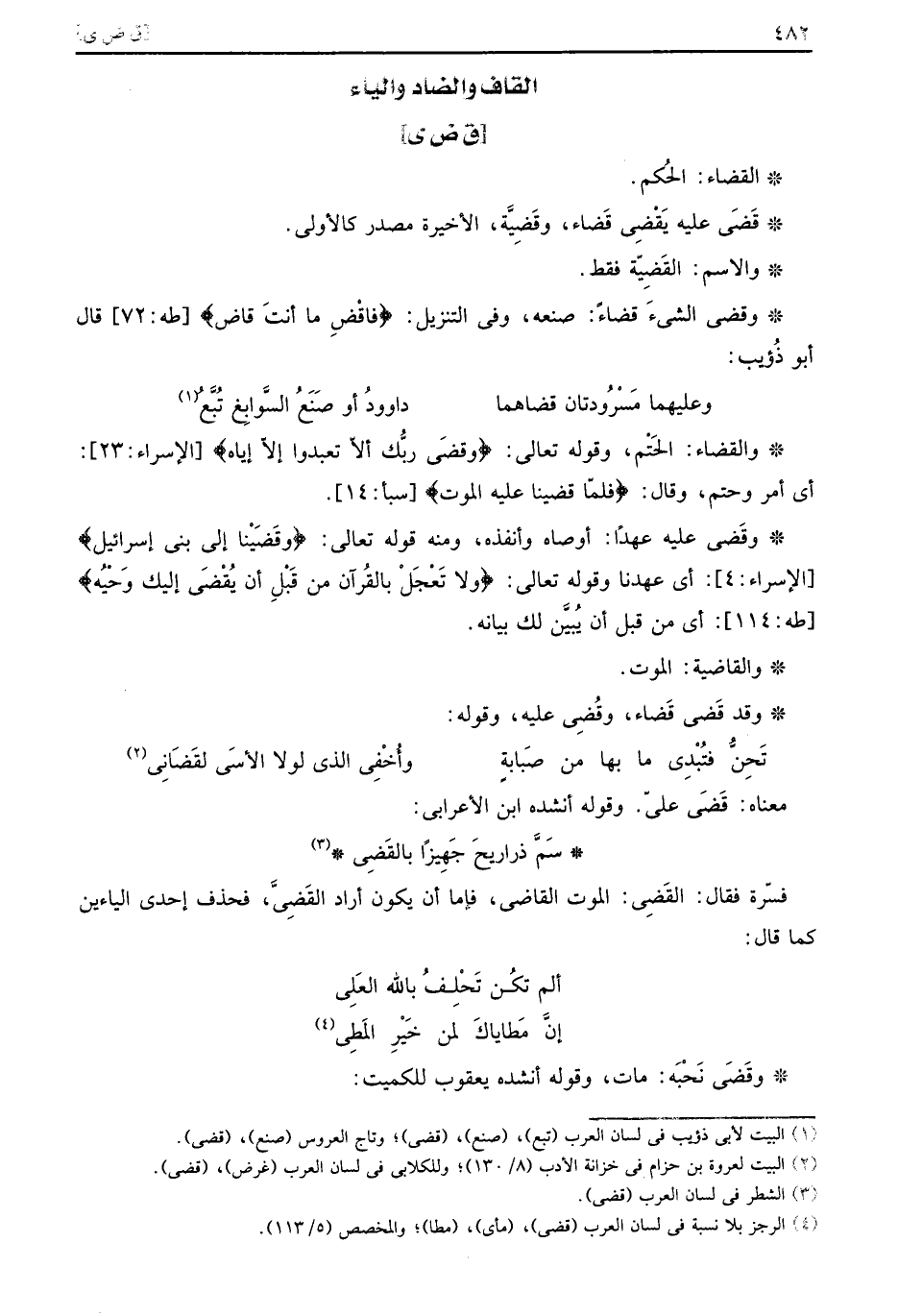 فسره فَقَالَ: القضى: الْمَوْت القَاضِي، فإمَّا أَن يكون أَرَادَ القضي، فَحذف إِحْدَى الياءين كَمَا قَالَ: