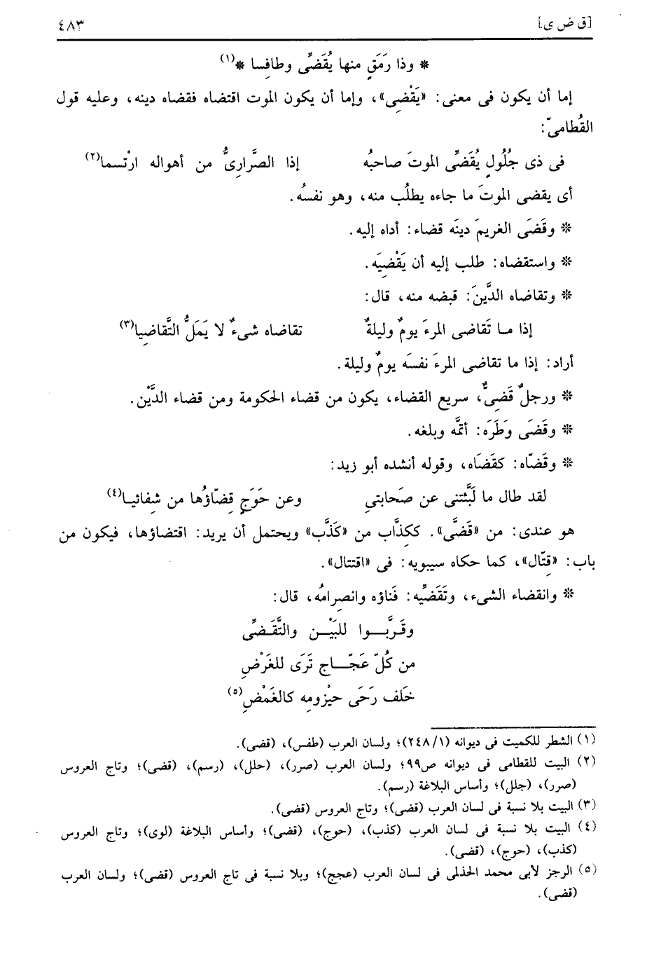 إِمَّا أَن يكون فِي معنى: " يقْضى "، وَإِمَّا أَن يكون الْمَوْت اقْتَضَاهُ فقضاه دينه، وَعَلِيهِ قَول الْقطَامِي: