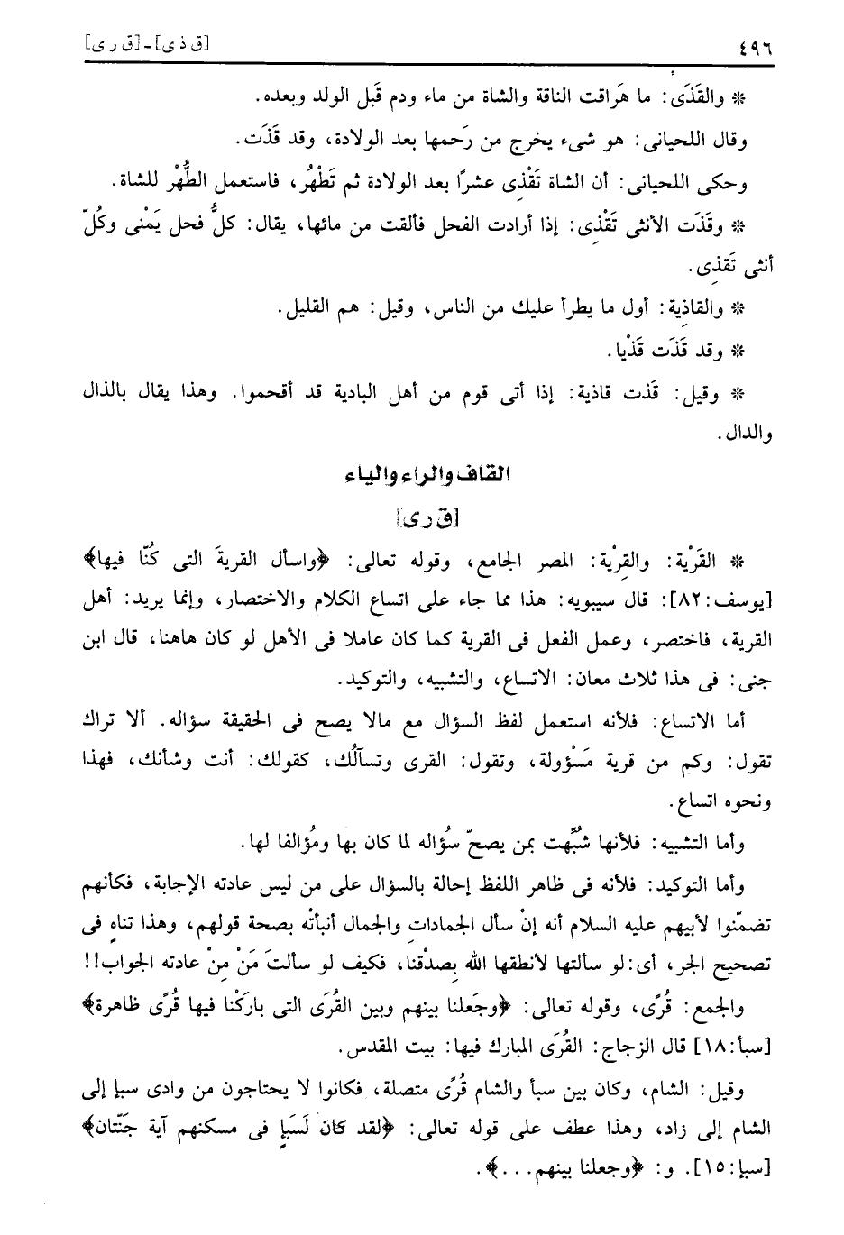 الْقرْيَة: والقرية: الْمصر الْجَامِع، وَقَوله تَعَالَى: (واسْأَل الْقرْيَة الَّتِي كُنَّا فِيهَا) قَالَ سِيبَوَيْهٍ: هَذَا مِمَّا جَاءَ على اتساع الْكَلَام والاختصار، وَإِنَّمَا يُرِيد: أهل الْقرْيَة، فاختصر، وَعمل الْفِعْل فِي الْقرْيَة كَمَا كَانَ عَاملا فِي الْأَهْل لَو كَانَ هَاهُنَا، قَالَ ابْن جني: فِي هَذَا ثَلَاث معَان: الاتساع، والتشبيه، والتوكيد.