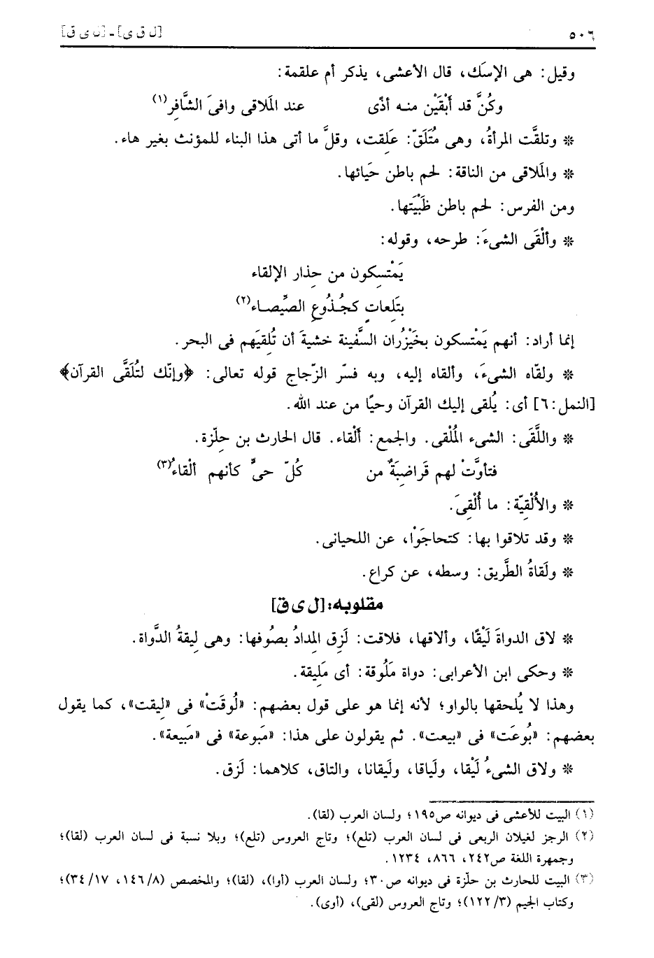 وتلقت المراة، وَهِي متلق: علقت، وَقل مَا أَتَى هَذَا الْبناء للمؤنث بِغَيْر هَاء.