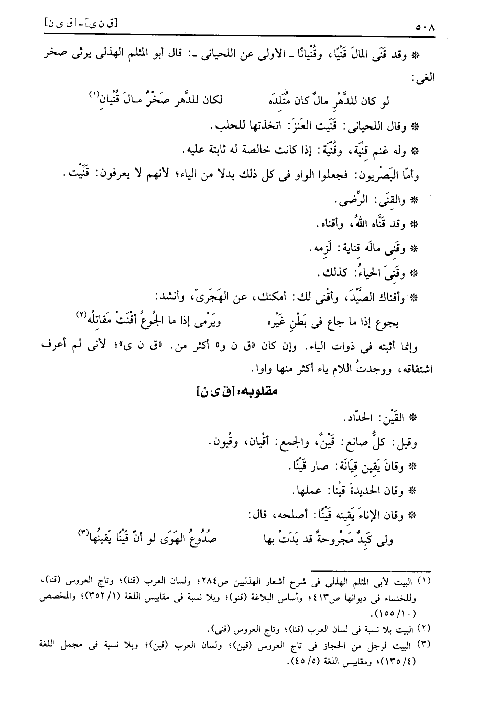 وَإِنَّمَا أثْبته فِي ذَوَات الْيَاء، وَإِن كَانَ " ق ن و" اكثر من " ق ن ي "، لِأَنِّي لم أعرف اشتقاقه، وَوجدت اللَّام يَاء اكثر مِنْهَا واوا.