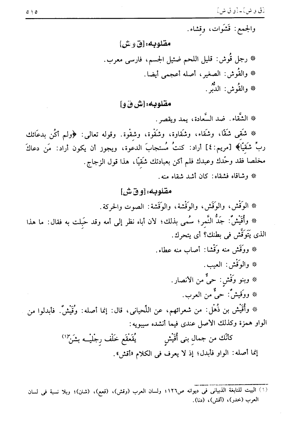وأقيش بن ذهل: من شعرائهم، عَن اللحياني، قَالَ: إِنَّمَا أَصله: وقيش، فأبدلوا من الْوَاو همزَة. وَكَذَلِكَ الأَصْل عِنْدِي فِيمَا أنْشدهُ سِيبَوَيْهٍ: