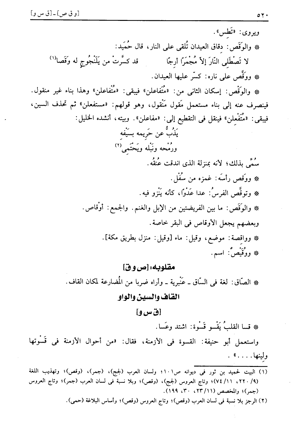 والوقص: إسكان الثَّانِي من: " متفاعلن " فَيبقى " متفاعلن " وَهَذَا بِنَاء غير مَنْقُول. فَيَنْصَرِف عَنهُ إِلَى بِنَاء مُسْتَعْمل مقول مَنْقُول، وَهُوَ قَوْلهم: " مستفعلن " ثمَّ تحذف السِّين، فَيبقى: " متفعلن " فينقل فِي التقطيع إِلَى: " مفاعلن " وبيته، أنْشدهُ الْخَلِيل: