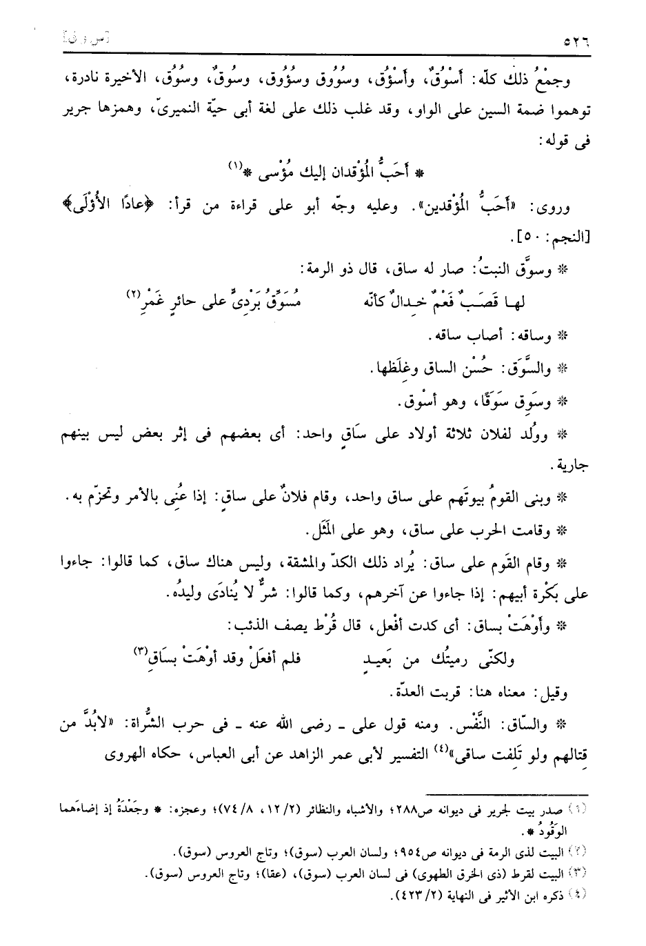 وَجمع ذَلِك كُله: أسوق، وأسؤق، وسووق وسؤوق، وسوق، الْأَخِيرَة نادرة، توهموا ضمة السِّين على الْوَاو، وَقد غلب ذَلِك على لُغَة أبي حَيَّة النميري، وهمزها جرير فِي قَوْله: أحب المؤقدان إِلَيْك مؤسى وروى: " أحب المؤقدين ". وَعَلِيهِ وَجه أَبُو عَليّ قِرَاءَة من قَرَأَ: (عاداً الأولى) .