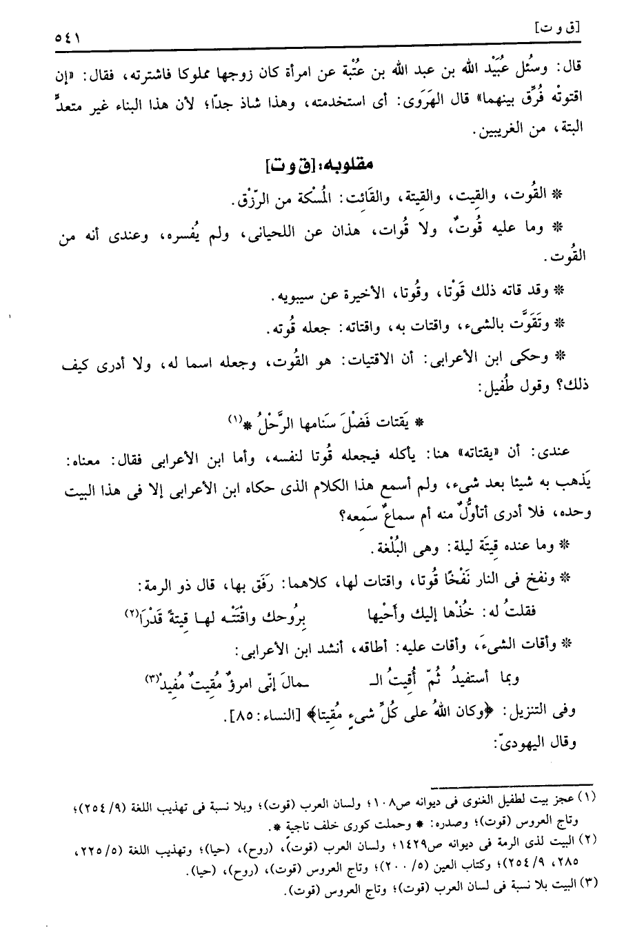 وَحكى ابْن الْأَعرَابِي: أَن الاقتيات: هُوَ الْقُوت، وَجعله اسْما لَهُ، وَلَا ادري كَيفَ ذَلِك؟؟ وَقَول طفيل: