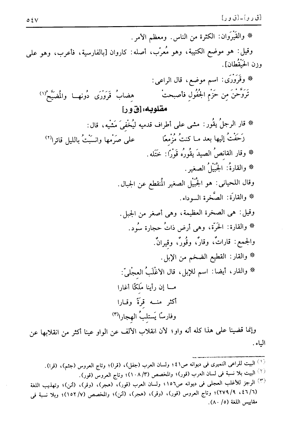 قار الرجل يقور: مَشى على أَطْرَاف قَدَمَيْهِ ليخفي مَشْيه، قَالَ: