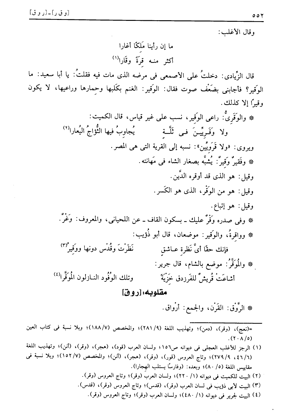 قَالَ الزيَادي: دخلت على الْأَصْمَعِي فِي مَرضه الَّذِي مَاتَ فِيهِ فَقلت: يَا أَبَا سعيد: مَا الوقير؟ فَأَجَابَنِي بِضعْف صَوت فَقَالَ: الوقير: الْغنم بكلبها وحمارها وراعيها، لَا يكون وقيراً إِلَّا كَذَلِك.