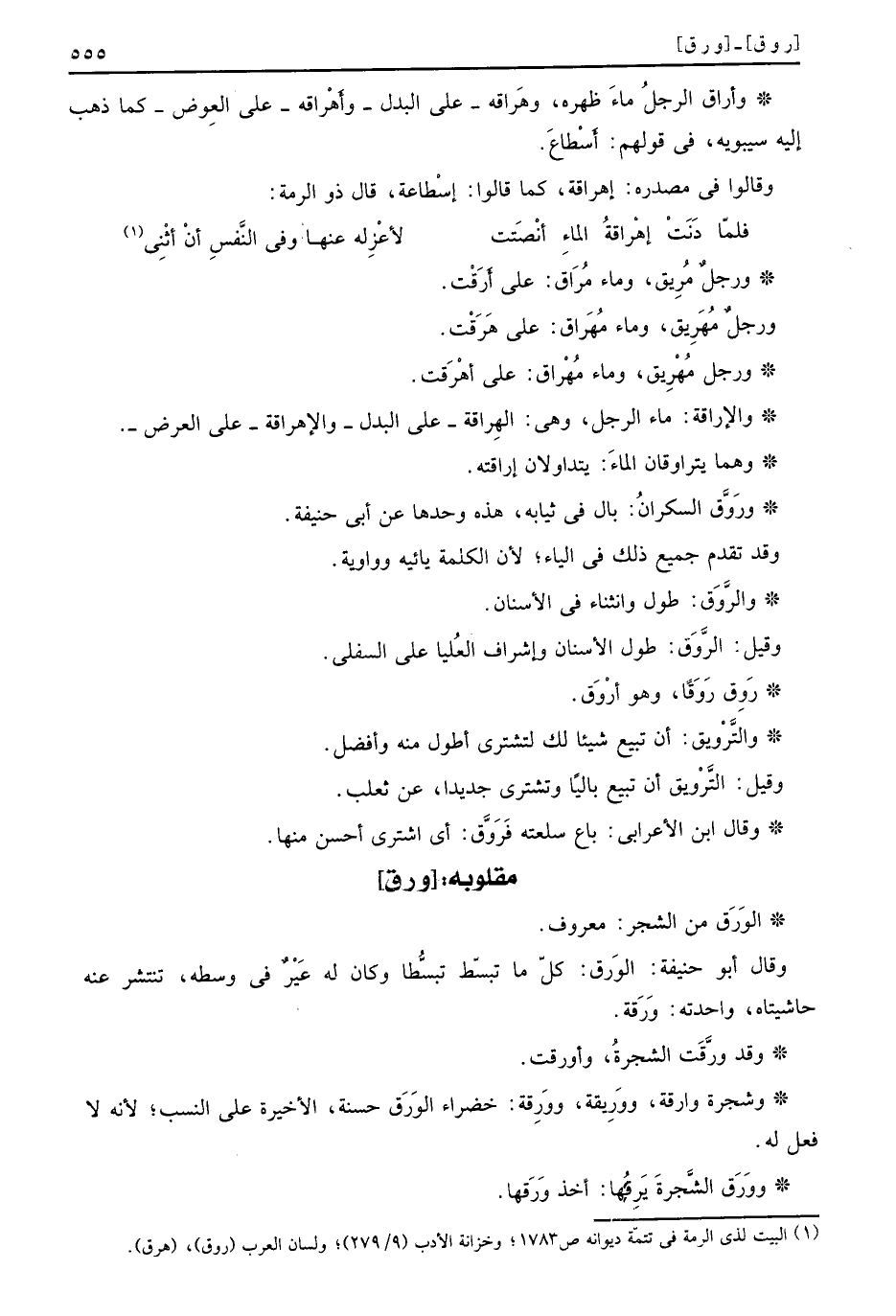 وأراق الرجل مَاء ظَهره، وهراقه، على الْبَدَل، وأهراقه، على الْعِوَض، كَمَا ذهب إِلَيْهِ سِيبَوَيْهٍ، فِي قَوْلهم: أسطاع.