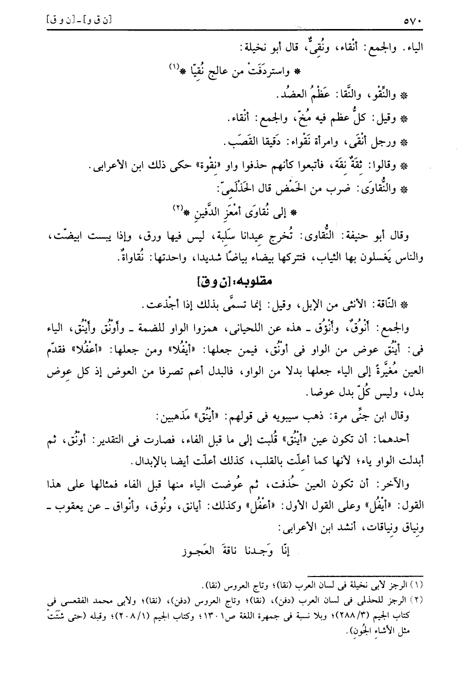 وَالْآخر: أَن تكون الْعين حذفت، ثمَّ عوضت الْيَاء مِنْهَا قبل الْفَاء. فمثالها على هَذَا القَوْل: " أيفل " وعَلى القَوْل الأول: " أعفل " وَكَذَلِكَ: أيانق، ونوق، وأنواق، عَن يَعْقُوب، ونياق ونياقات، انشد ابْن الْأَعرَابِي: