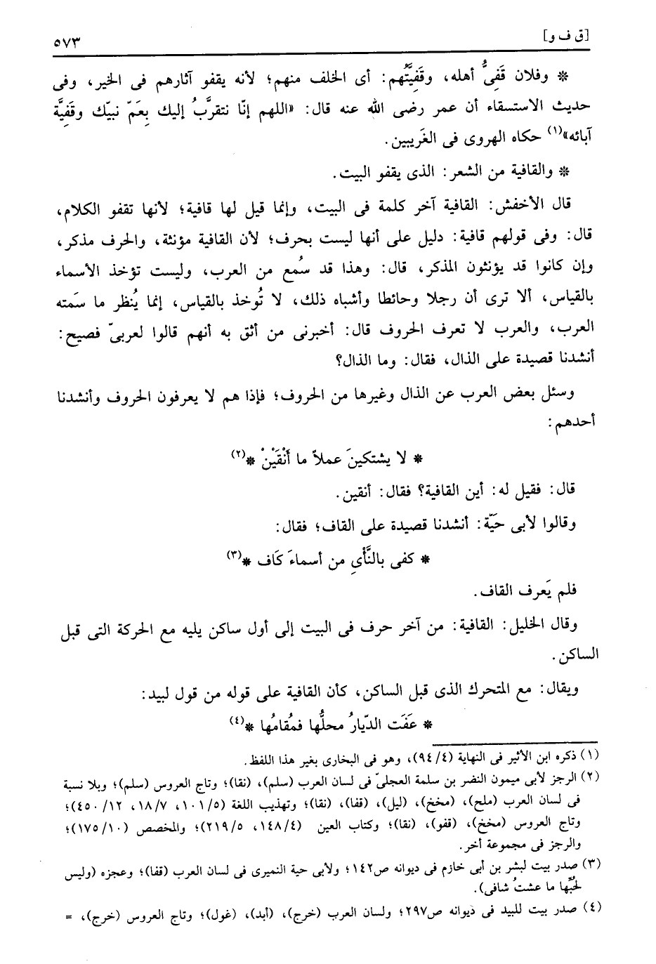 وَقَالَ الْخَلِيل: القافية: من آخر حرف فِي الْبَيْت إِلَى أول سَاكن يَلِيهِ مَعَ الْحَرَكَة الَّتِي قبل السَّاكِن.