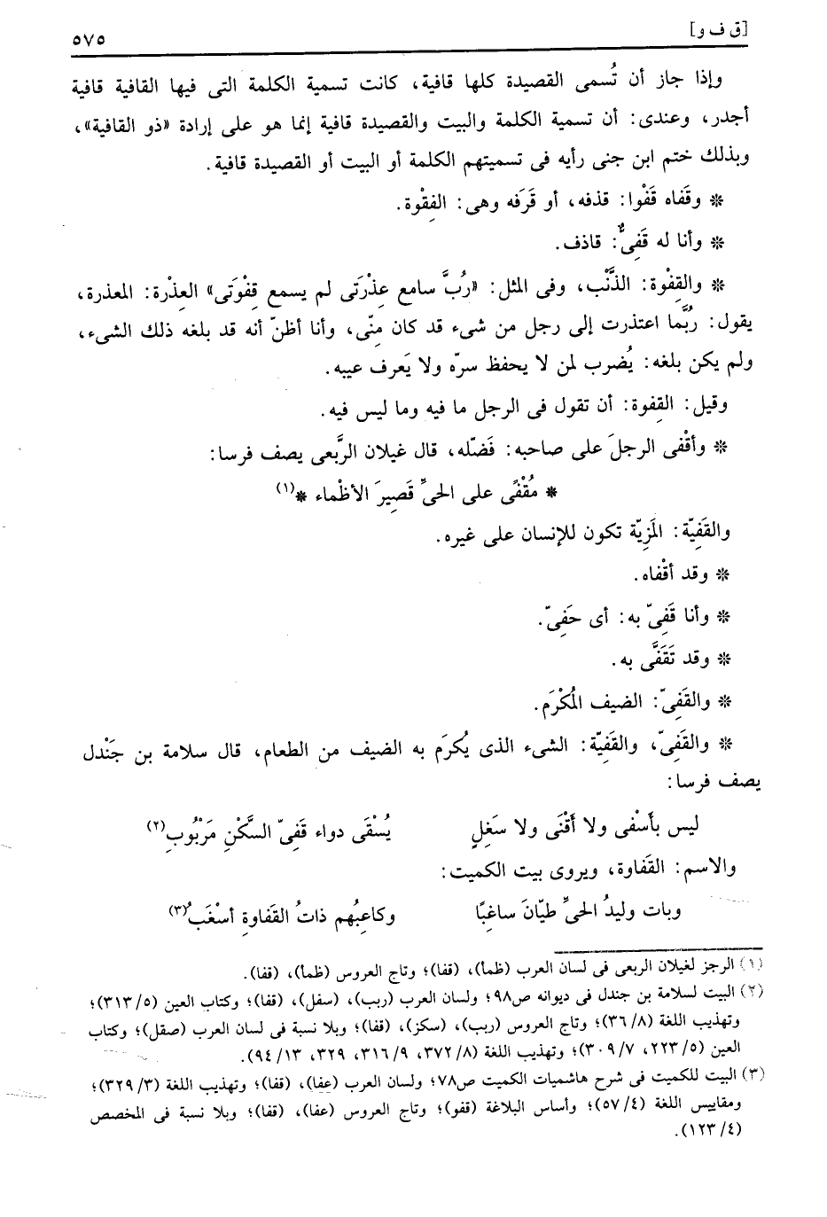 وَإِذا جَازَ أَن تسمى القصيدة كلهَا قافية، كَانَت تَسْمِيَة الْكَلِمَة الَّتِي فِيهَا القافية قافية أَجْدَر، وَعِنْدِي: أَن تَسْمِيَة الْكَلِمَة وَالْبَيْت وَالْقَصِيدَة قافية إِنَّمَا هُوَ على إِرَادَة ذُو القافية، وَبِذَلِك ختم ابْن جني رَأْيه فِي تسميتهم الْكَلِمَة أَو الْبَيْت أَو القصيدة قافية.