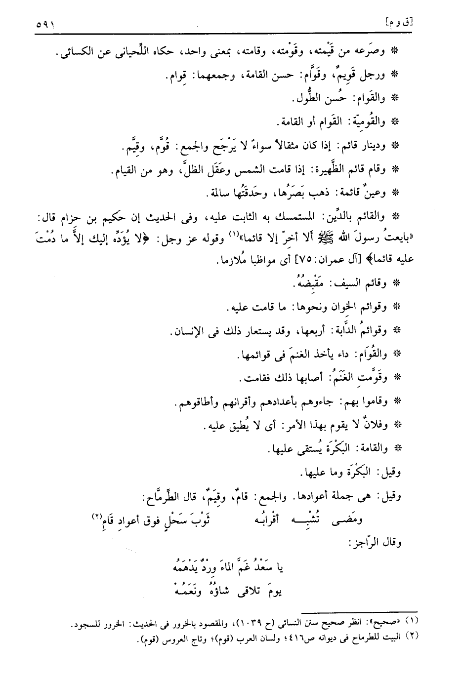 والقائم بِالدّينِ: المستمسك بِهِ الثَّابِت عَلَيْهِ، وَفِي الحَدِيث إِن حَكِيم بن حزَام قَالَ: " بَايَعت رَسُول الله صَلَّى اللهُ عَلَيْهِ وَسَلَّمَ أَلا أخر إِلَّا قَائِما " وَقَوله عز وَجل: (لَا يؤده إِلَيْك إِلَّا مَا دمت عَلَيْهِ قَائِما) أَي مواظبا ملازما.