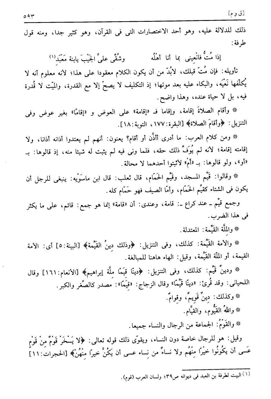 وَالْأمة الْقيمَة: كَذَلِك، وَفِي التَّنْزِيل: (وذَلِك دين الْقيمَة) أَي: الْأمة الْقيمَة، أَو الْملَّة الْقيمَة، وَقيل: الْهَاء هَاهُنَا للْمُبَالَغَة.
