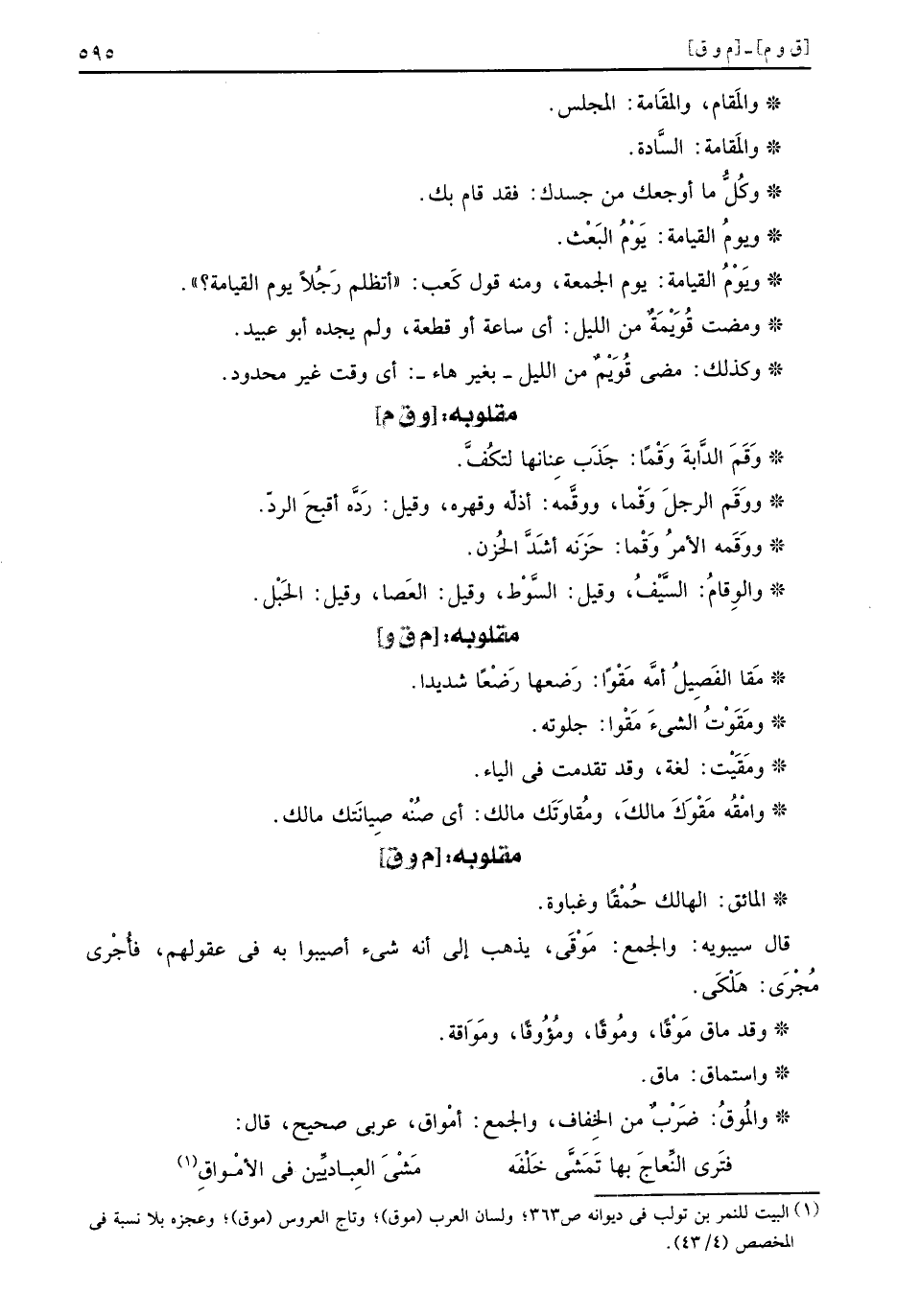 وَيَوْم الْقِيَامَة: يَوْم الْجُمُعَة، وَمِنْه قَول كَعْب: " أتظلم رجلا يَوْم الْقِيَامَة؟؟ " وَمَضَت قويمة من اللَّيْل: أَي سَاعَة أَو قِطْعَة، وَلم يجده أَبُو عبيد.