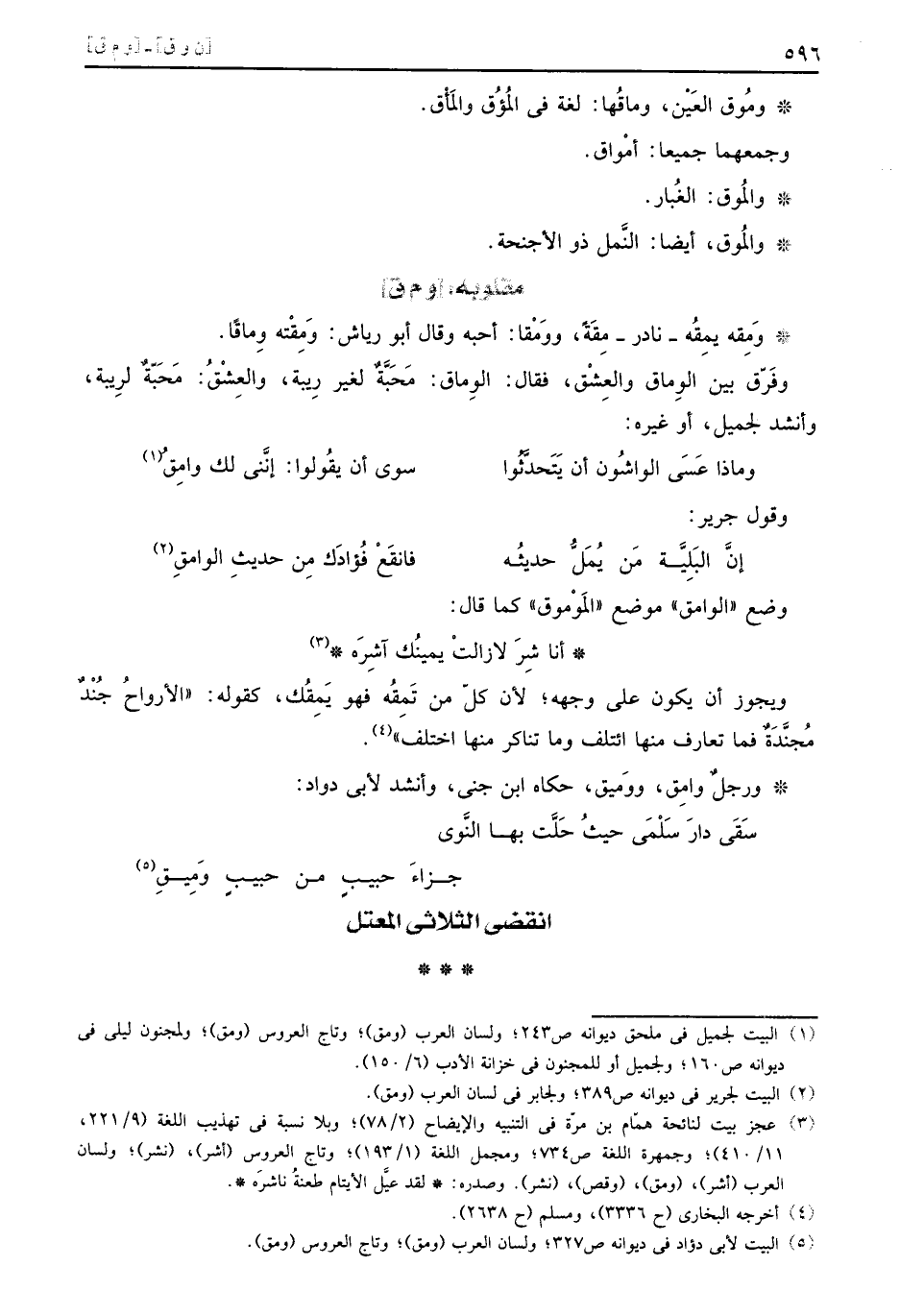 وَفرق بَين الوماق والعشق، فَقَالَ: الوماق: محبَّة لغير رِيبَة، والعشق: محبَّة لريبة، وانشد لجميل، أَو غَيره: