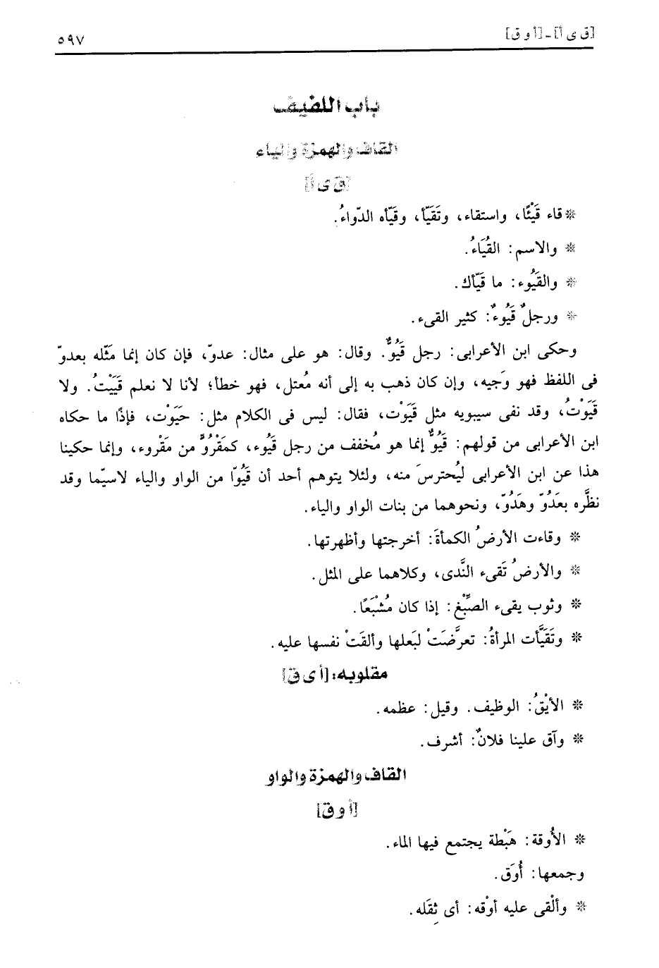 وَحكى ابْن الْأَعرَابِي: رجل قيوٌّ. وَقَالَ: هُوَ على مِثَال: عَدو، فَإِن كَانَ إِنَّمَا مثله بعدو فِي اللَّفْظ فَهُوَ وجيه، وَإِن كَانَ ذهب بِهِ إِلَى أَنه معتل، فَهُوَ خطأ، لأَنا لَا نعلم قييت. وَلَا قيوت، وَقد نفى سِيبَوَيْهٍ مثل قيوت، فَقَالَ: لَيْسَ فِي الْكَلَام مثل: حيوت، فَإِذا مَا حَكَاهُ ابْن الْأَعرَابِي من قَوْلهم: قيو إِنَّمَا هُوَ مخفف من رجل قيوء، كمقرو من مقروء، وَإِنَّمَا حكينا هَذَا عَن ابْن الْأَعرَابِي ليحترس مِنْهُ، وَلِئَلَّا يتَوَهَّم أحد أَن قيواً من الْوَاو وَالْيَاء لَا سِيمَا وَقد نظره بعدوّ وهدوّ، وَنَحْوهمَا من بَنَات الْوَاو وَالْيَاء.
