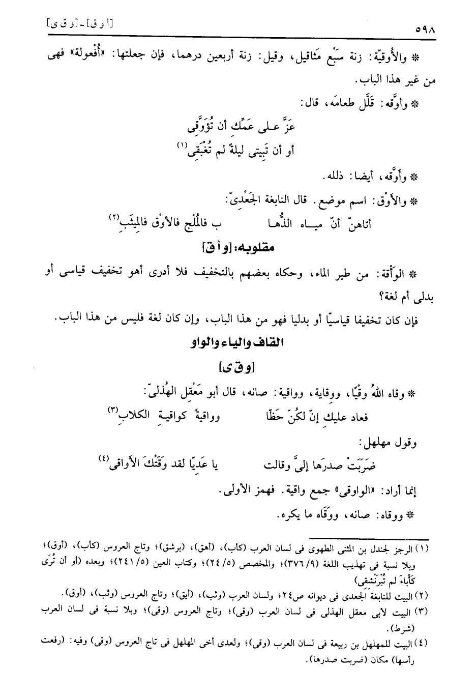 وَالْأُوقِية: زنة سبع مَثَاقِيل، وَقيل: زنة أَرْبَعِينَ درهما، فَإِن جَعلتهَا: " أفعولة " فَهِيَ من غير هَذَا الْبَاب.