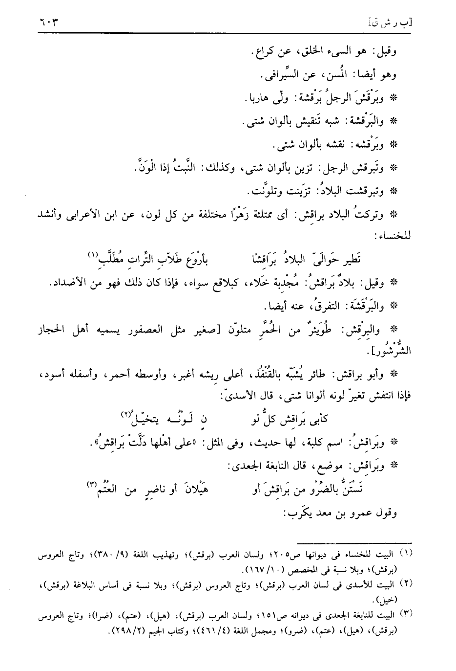 وَتركت الْبِلَاد براقش: أَي ممتلئة زهراً مُخْتَلفَة من كل لون، عَن ابْن الْأَعرَابِي وَأنْشد للخنساء: