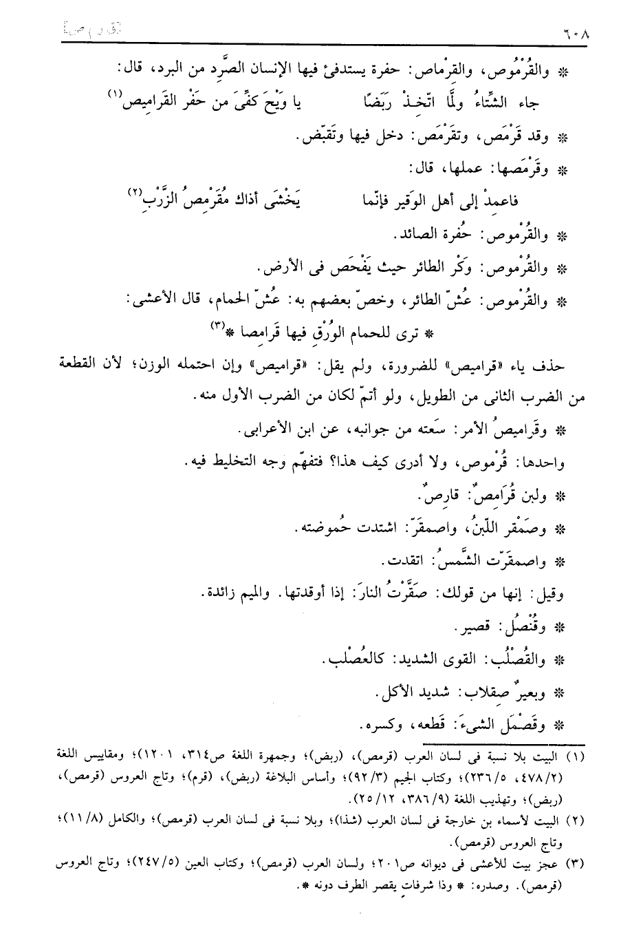 والقرموص، والقرماص: حُفْرَة يستدفي فِيهَا الْإِنْسَان الصرد من الْبرد، قَالَ: