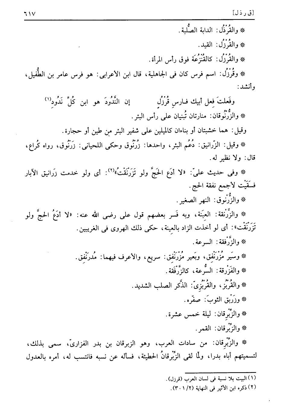 وَقيل: الزرانيق: دعم الْبِئْر، وَاحِدهَا: زرنوق. وَحكى اللحياني: زرنوق، رَوَاهُ كرَاع، قَالَ: وَلَا نَظِير لَهُ.
