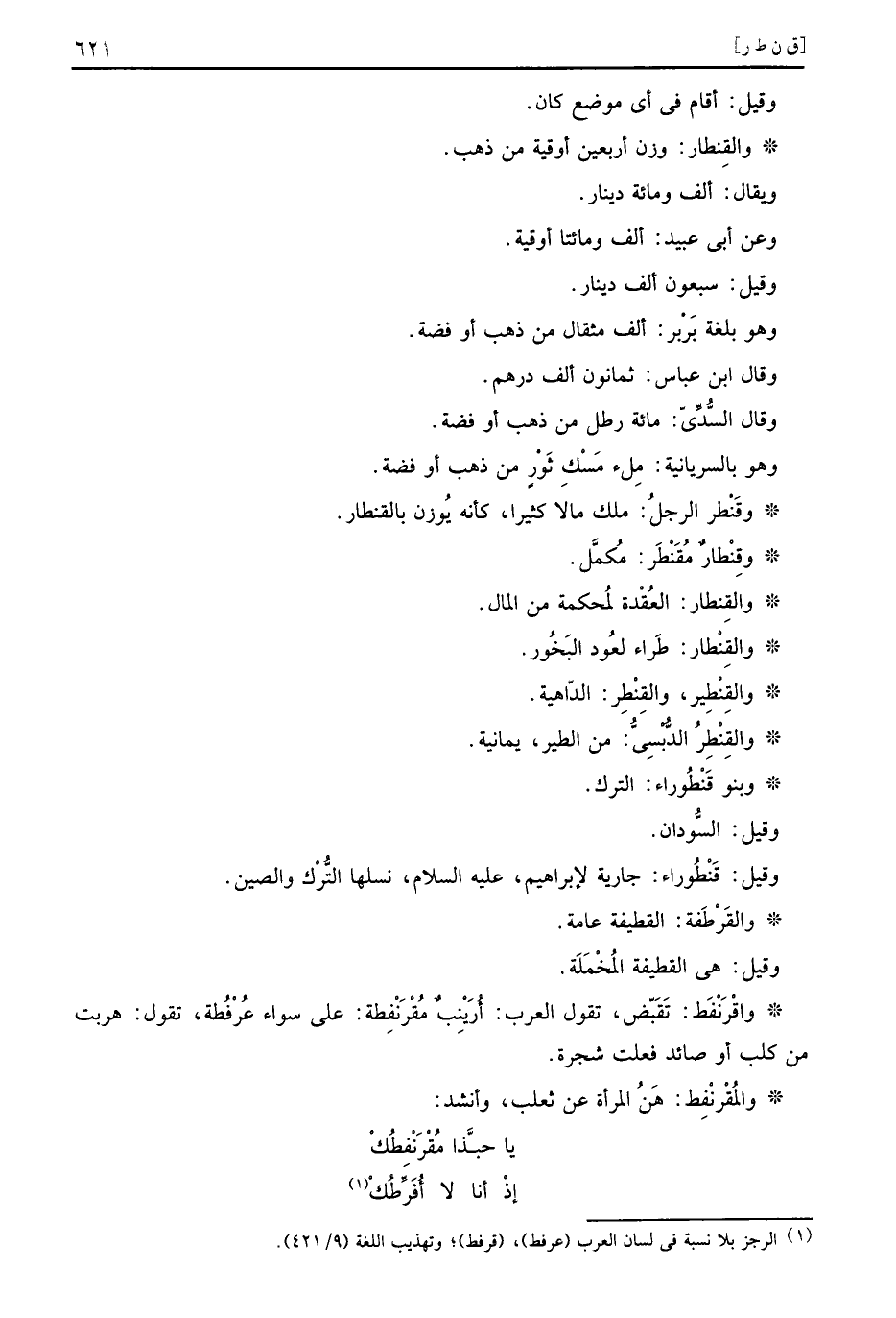 وَقَالَ السّديّ: مائَة رَطْل من ذهب أَو فضَّة. وَهُوَ بالسُّرْيَانيَّة: ملْء مسك ثَوْر من ذهب أَو فضَّة.