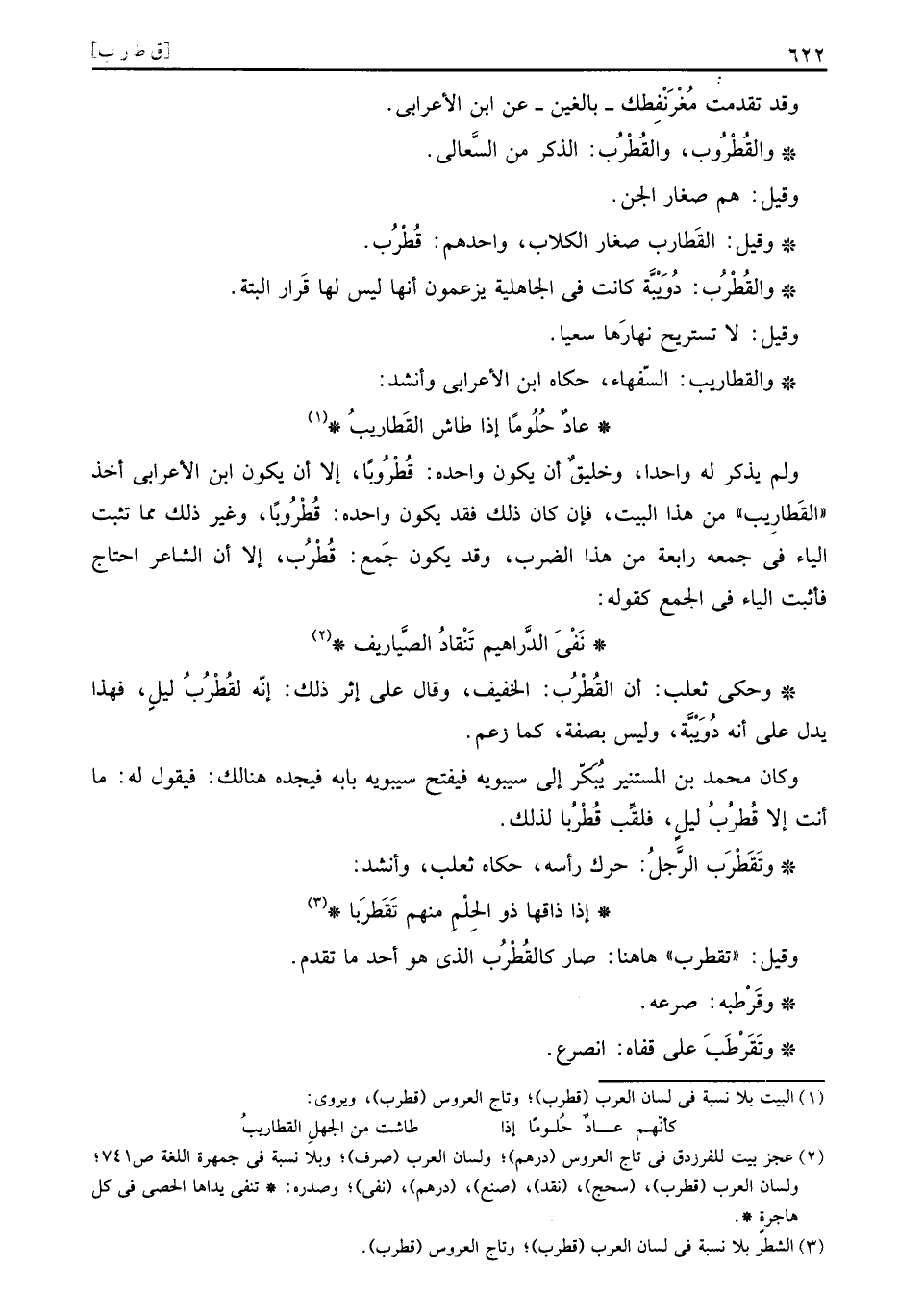 وَلم يذكر لَهُ وَاحِدًا، وخليق أَن يكون واحده: قطروباً، إِلَّا أَن يكون ابْن الْأَعرَابِي اخذ " القطاريب " من هَذَا الْبَيْت، فَإِن كَانَ ذَلِك فقد يكون واحده: قطروباً، وَغير ذَلِك مِمَّا تثيت الْيَاء فِي جمعه رَابِعَة من هَذَا الضَّرْب، وَقد يكون جمع: قطرب، إِلَّا أَن الشَّاعِر احْتَاجَ فَأثْبت الْيَاء فِي الْجمع كَقَوْلِه: