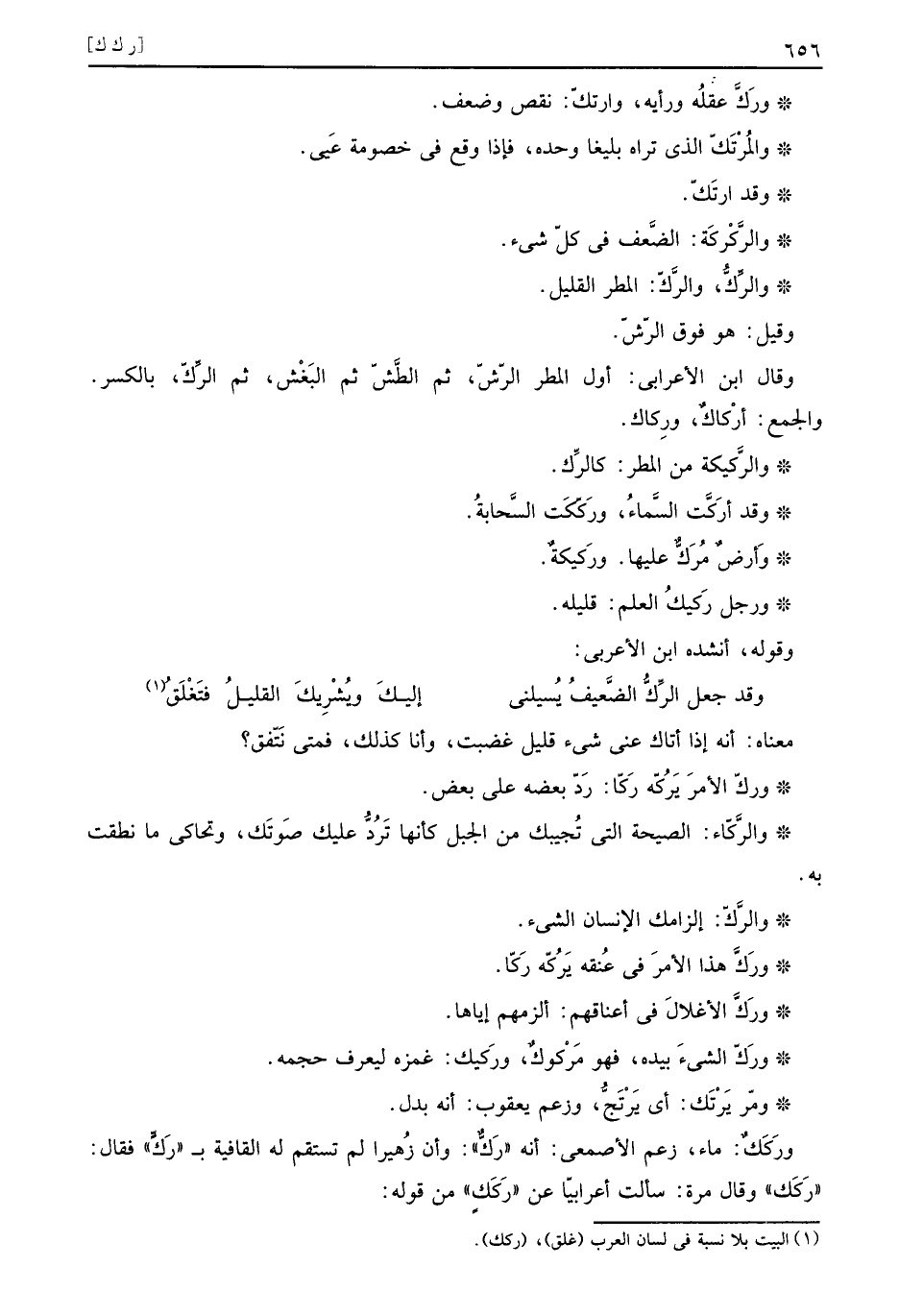 وركك: مَاء، زعم الْأَصْمَعِي: أَنه " رك "، وَأَن زهيرا لم تستقم لَهُ القافية برك " فَقَالَ: " ركك " وَقَالَ مرّة: سَأَلت أعرابياًّ عَن " ركك " من قَوْله: