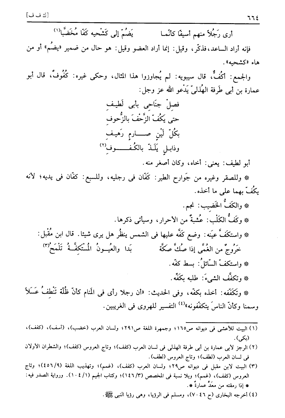 وَالْجمع: أكف، قَالَ سِيبَوَيْهٍ: لم يجاوزوا هَذَا الْمِثَال، وَحكى غَيره: كفوف، قَالَ أَبُو عمَارَة ابْن أبي طرفَة الْهُذلِيّ يَدْعُو الله عز وَجل: