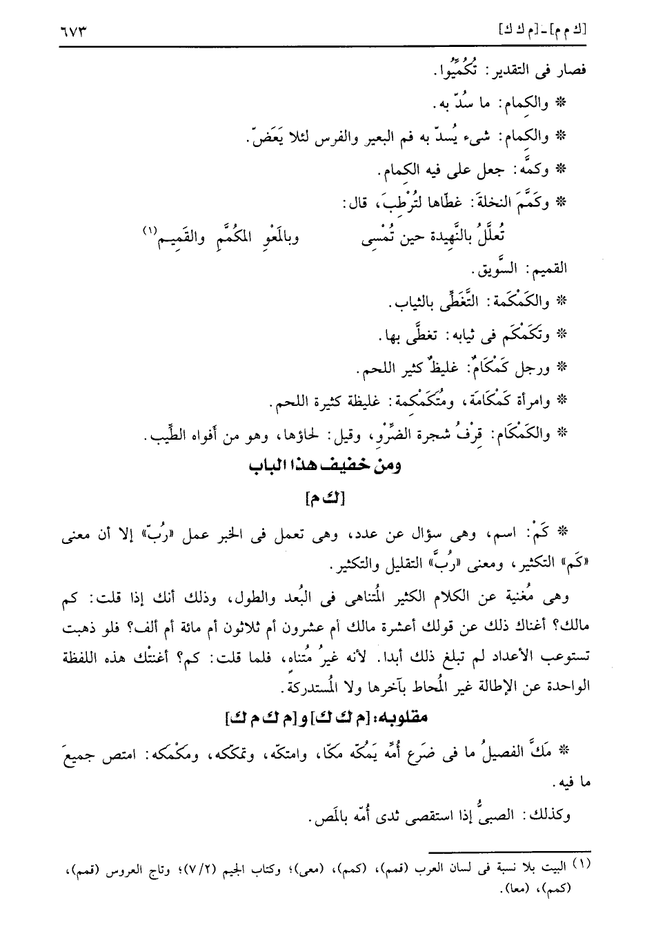 كم: اسْم، وَهِي سُؤال عَن عدد، وَهِي تعْمل فِي الْخَبَر عمل " رب " إِلَّا أَن معنى " كم " التكثير، وَمعنى " رب " التقليل والتكثير.