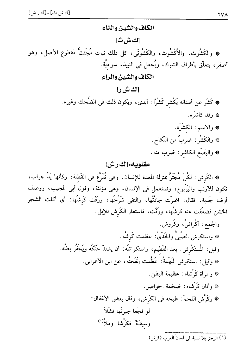 الكرش: لكل مجتر بِمَنْزِلَة الْمعدة للْإنْسَان. وَهِي تفرغ فِي القطنة، وَكَأَنَّهَا يَد جراب، تكون للارنب واليربوع، وتستعمل فِي الْإِنْسَان، وَهِي مُؤَنّثَة وَقَول أبي الْمُجيب، وَوصف أَرضًا جدبة، فَقَالَ: اغبرت جادتها، والتقى سرحها، ورقت كرشها: أَي أكلت الشّجر الخشن فضعفت عَنهُ كرشها، ورقت، فاستعار الكرش لِلْإِبِلِ.