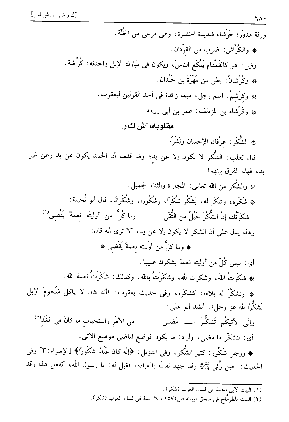 وتشكر لَهُ بلاءه: كشكره، وَفِي حَدِيث يَعْقُوب: " أَنه كَانَ لَا يَأْكُل شحوم الْإِبِل تشكراً لله عز وَجل " انشد أَبُو عَليّ: