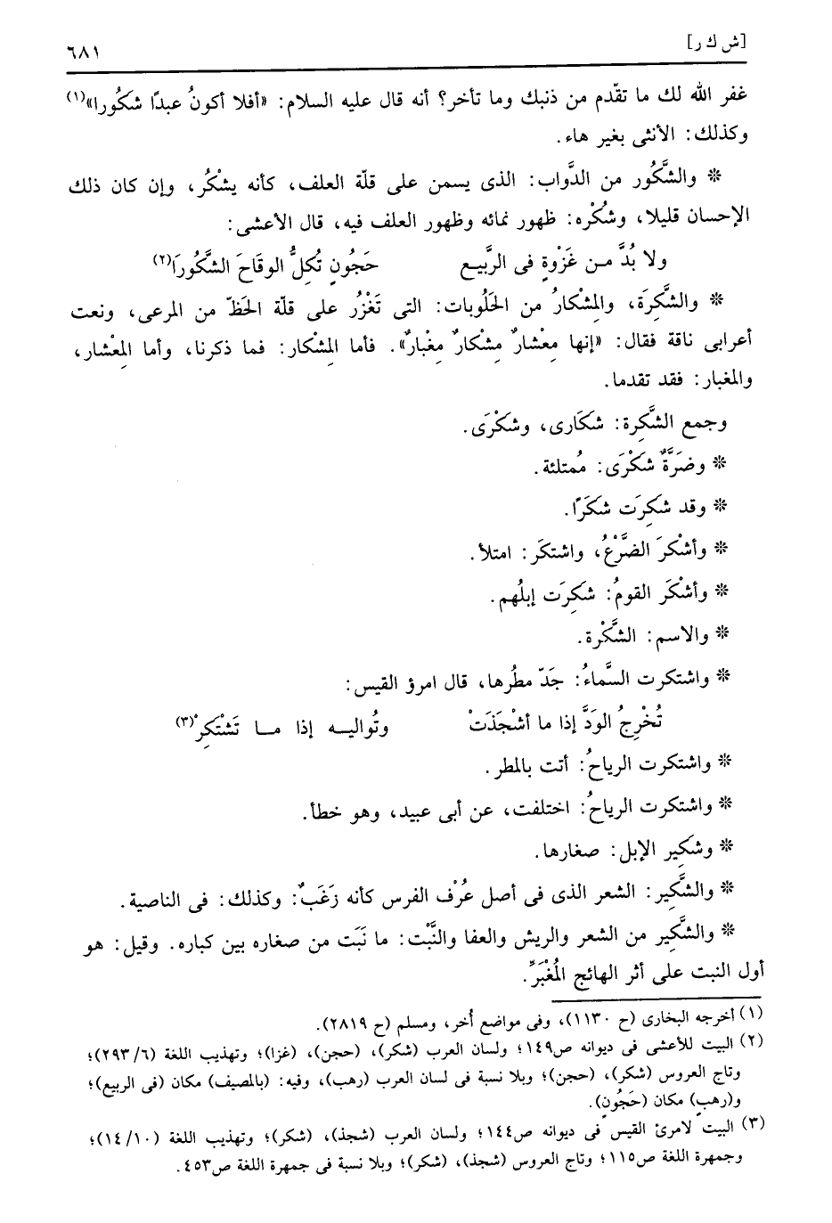 والشكور من الدَّوَابّ: الَّذِي يسمن على قلَّة الْعلف، كَأَنَّهُ يشْكر، وَإِن كَانَ ذَلِك الْإِحْسَان قيلا، وشكره: ظُهُور نمائه وَظُهُور الْعلف فِيهِ، قَالَ الْأَعْشَى: