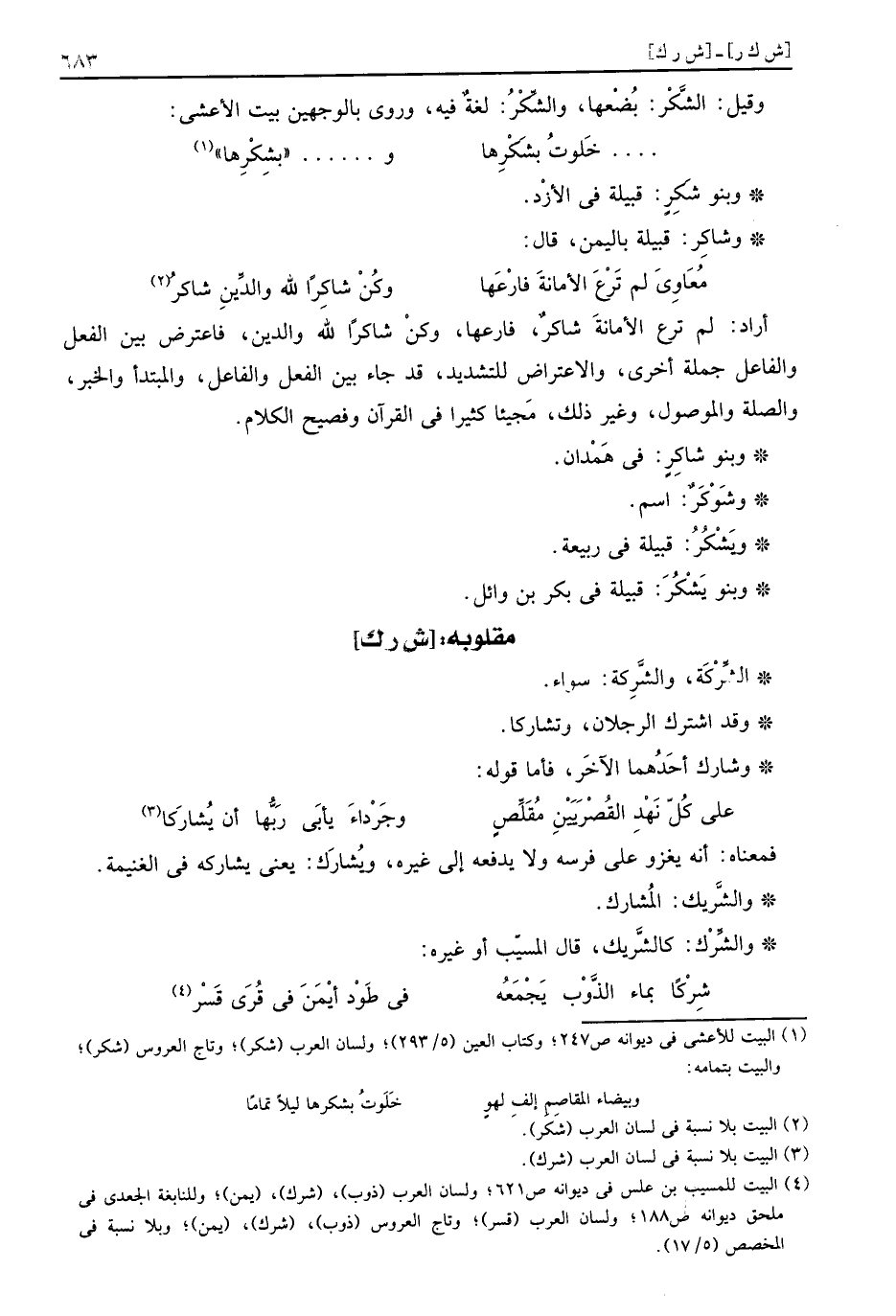 وَقيل: الشُّكْر: بضعهَا، وَالشُّكْر: لُغَة فِيهِ، وَرُوِيَ بِالْوَجْهَيْنِ بَيت الْأَعْشَى: