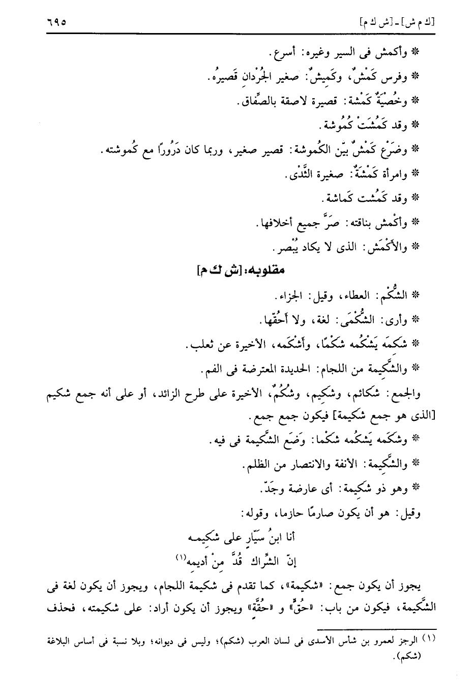 وَأرى: الشكمي: لُغَة، وَلَا احقها.