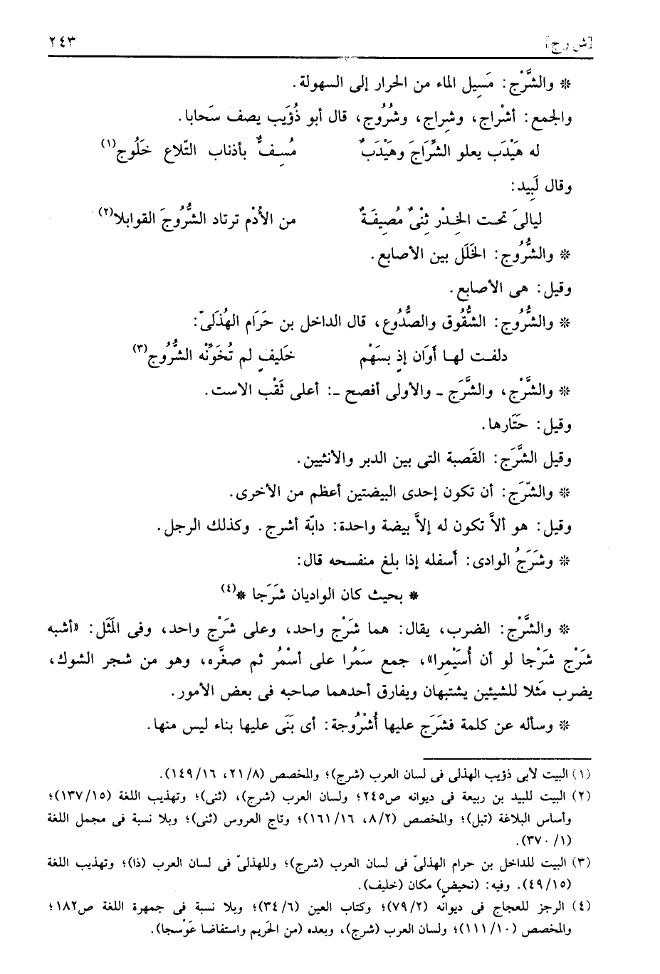 والشُّرُوج: الشقوق والصدوع، قَالَ الدَّاخِل ابْن حرَام الْهُذلِيّ: