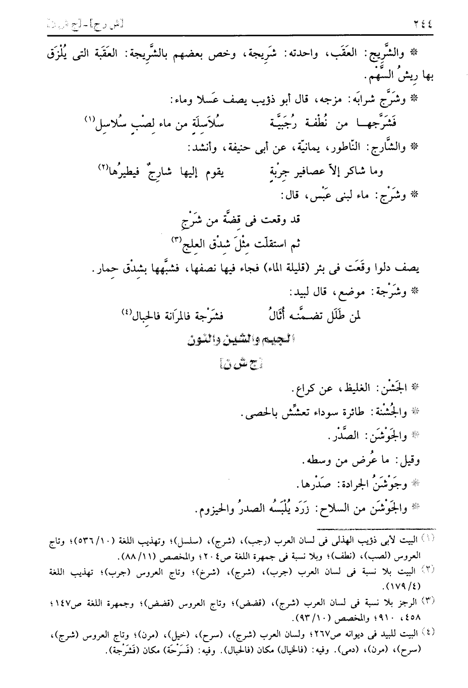 وشَرَّج شرابه: مزجه، قَالَ أَبُو ذُؤَيْب يصف عسلا وَمَاء: