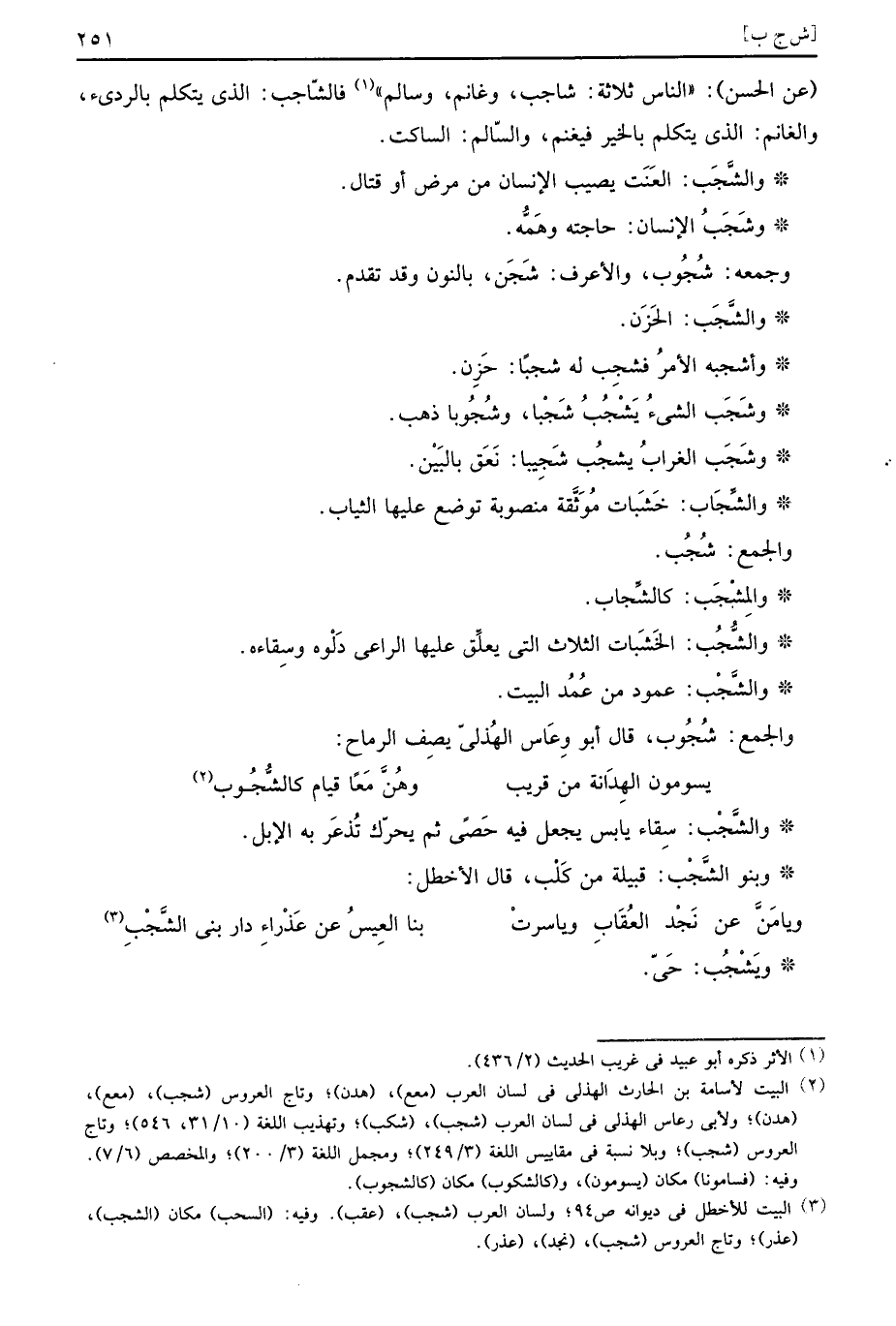عَن الْحسن: " النَّاس ثَلَاثَة: شاجب، وغانم وَسَالم " فالشّاجب: الَّذِي يتَكَلَّم بالرديء، والغانم: الَّذِي يتَكَلَّم بِالْخَيرِ فيغنم، والسالم: السَّاكِت.