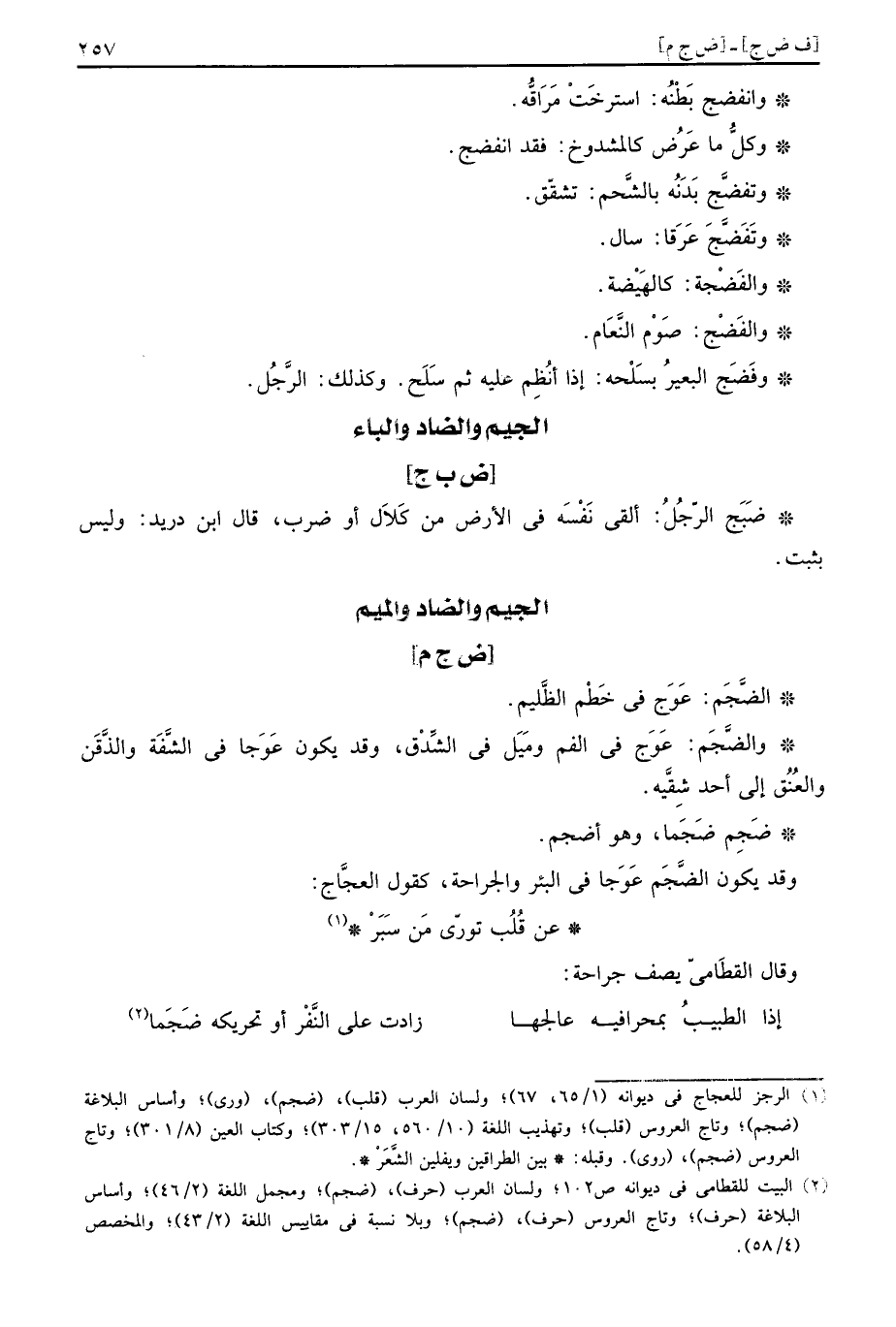 وَقد يكون الضَّجَم عوجا فِي الْبِئْر والجراحة، كَقَوْل العجاج: