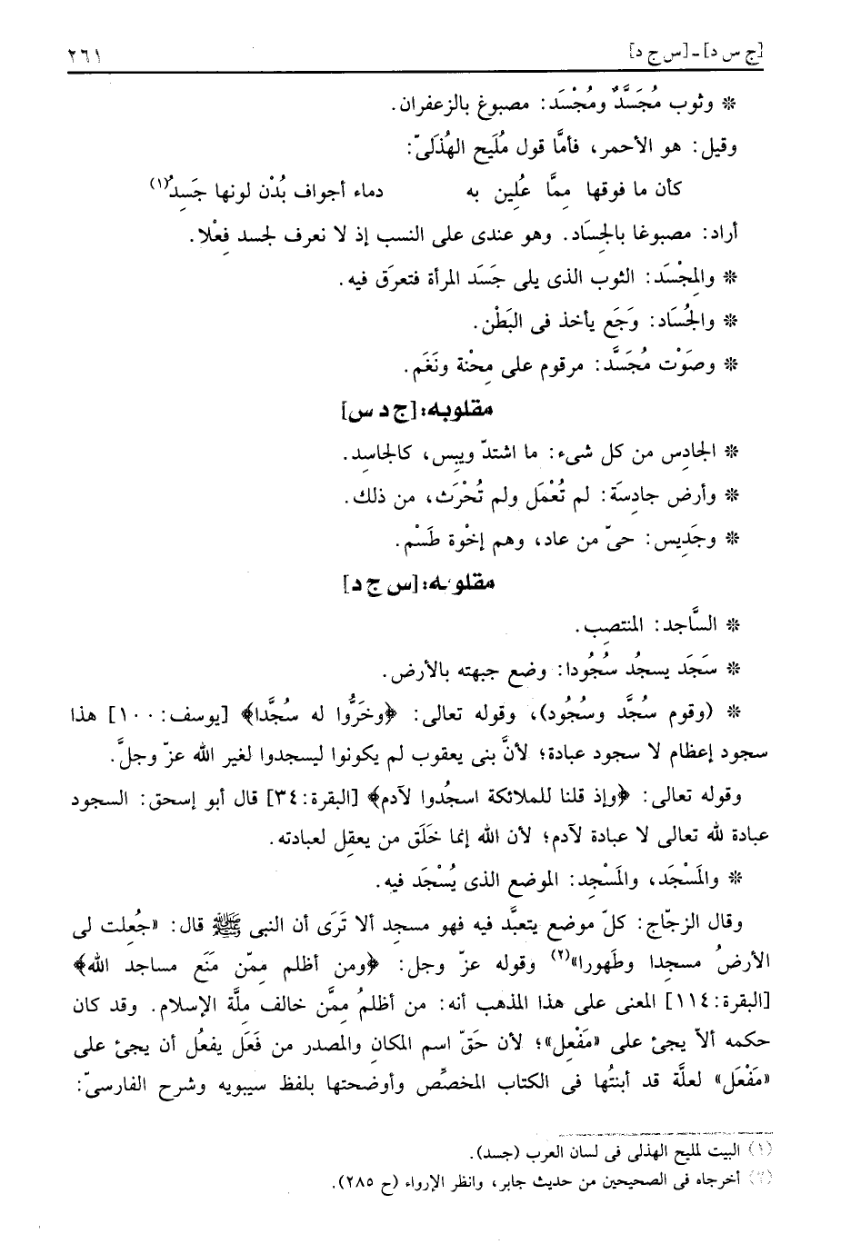 وَقَالَ الزّجاج: كل مَوضِع يتعبد فِيهِ فَهُوَ مسجِد أَلا ترى أَن النَّبِي صَلَّى اللهُ عَلَيْهِ وَسَلَّمَ قَالَ: " جعلت لي الأَرْض مسجِدا وطَهورا " وَقَوله عز وَجل: (ومن أظلم مِمّن مَنَع مَسَاجِد الله) الْمَعْنى على هَذَا الْمَذْهَب أَنه: من أظلم مِمَّن خَالف مِلَّة الْإِسْلَام. وَقد كَانَ حكمه أَلا يَجِيء على " مفعل "؛ لِأَن حق اسْم الْمَكَان والمصدر من فعل يفعل أَن يَجِيء على " مفعل " لعِلَّة قد ابْنَتهَا فِي الْكتاب الْمُخَصّص وأوضحتها بِلَفْظ سِيبَوَيْهٍ وَشرح الْفَارِسِي.