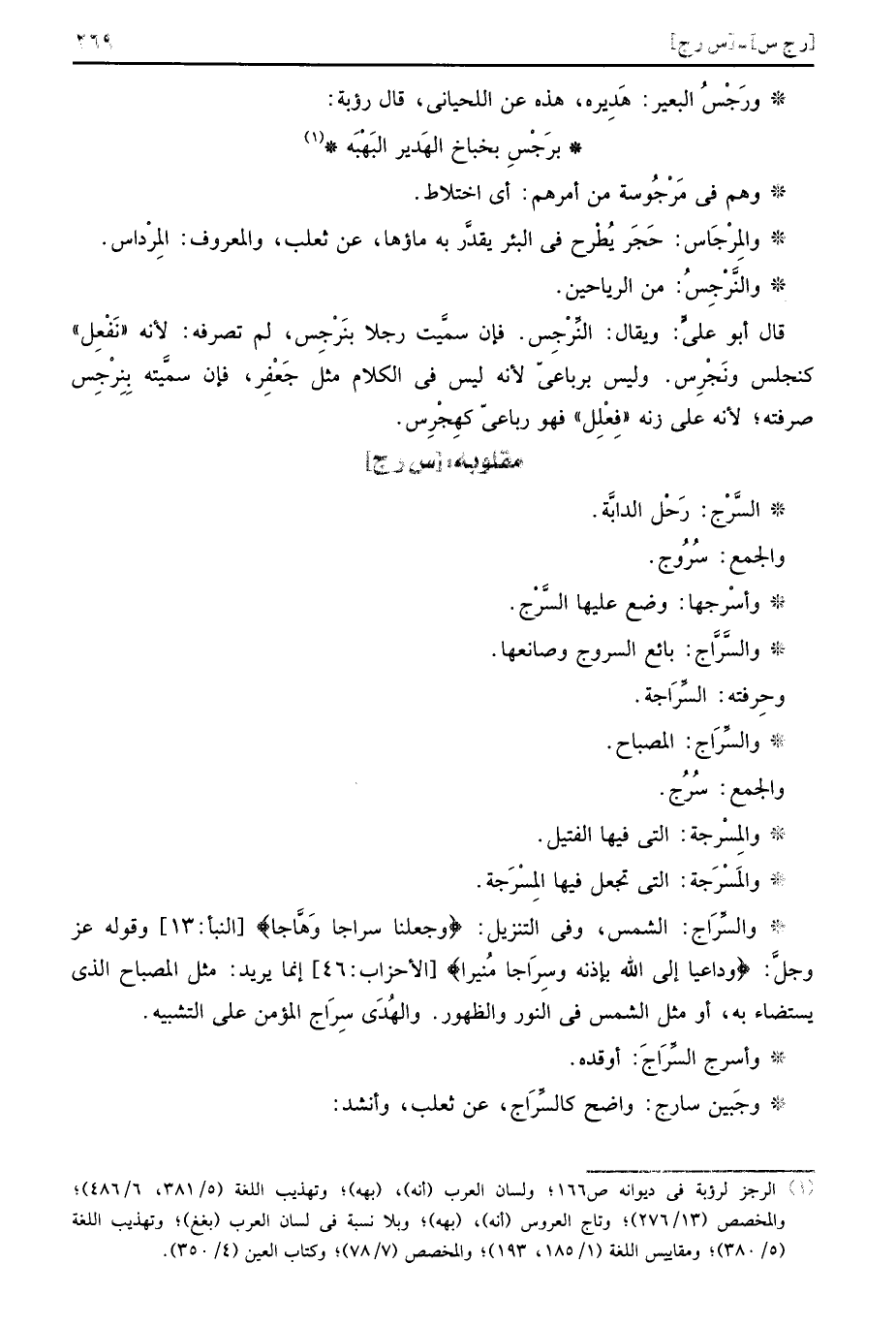 والسِّرَاج: الشَّمْس، وَفِي التَّنْزِيل: (وجعلنَا سِرَاجًا وَهَّاجا) وَقَوله عز وَجل: (ودَاعيا إِلَى الله بِإِذْنِهِ وسِرَاجا مُنيرا) إِنَّمَا يُرِيد: مثل الْمِصْبَاح الَّذِي يستضاء بِهِ، أَو مثل الشَّمْس فِي النُّور والظهور.