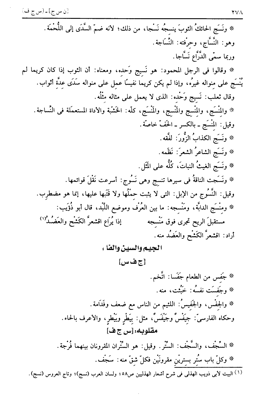 ومِنْسَج الدَّابَّة، ومَنْسِجه: مَا بَين الْعرف وَمَوْضِع اللبد، قَالَ أَبُو ذُؤَيْب: