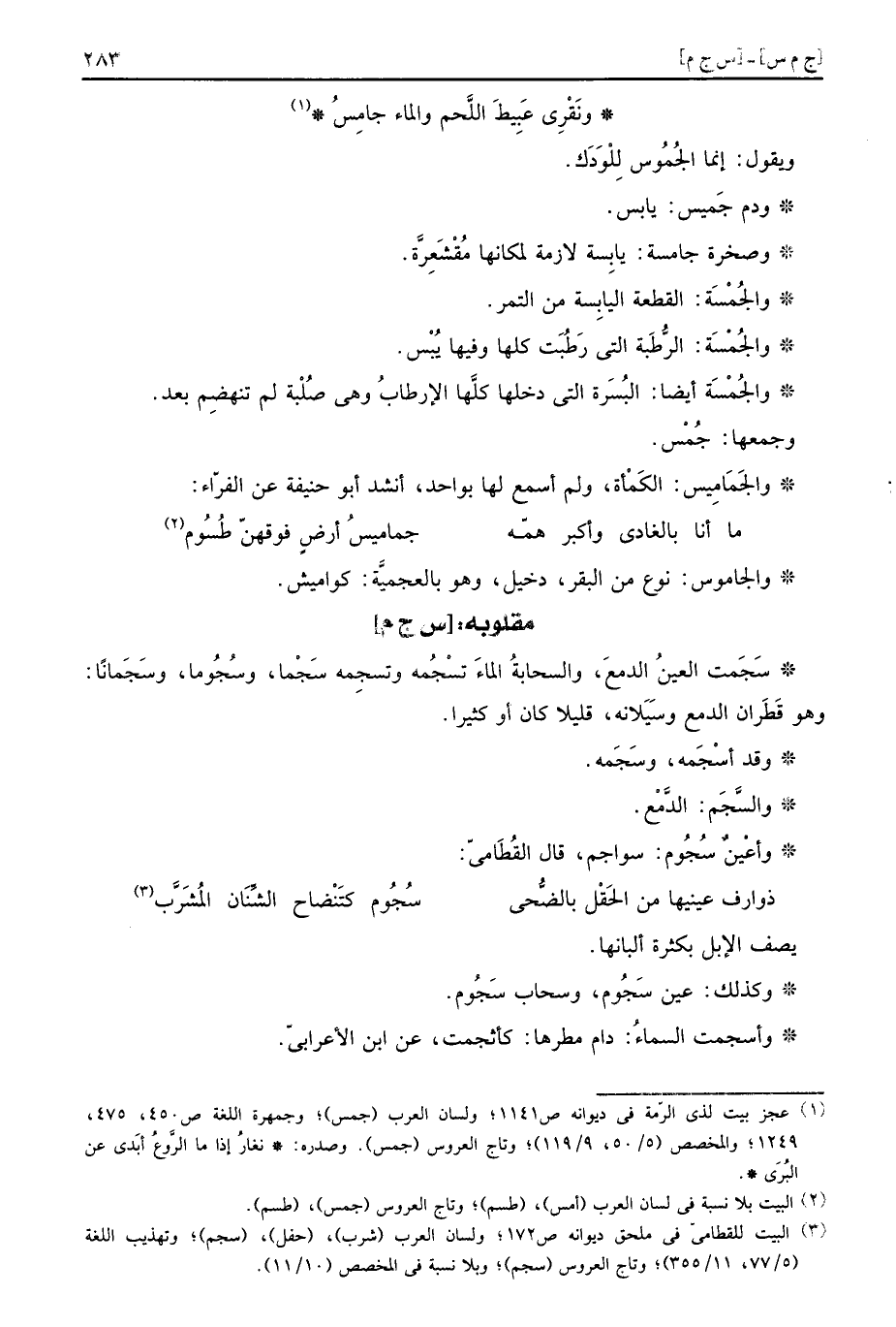 والجاموس: نوع من الْبَقر، دخيل، وَهُوَ بالعجمية: كواميش.