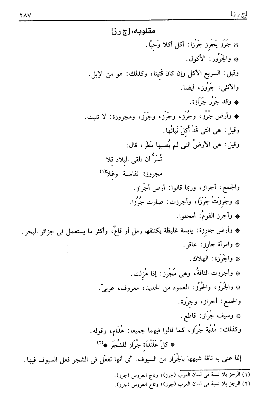 وَأَرْض جارِزة: يابسة غَلِيظَة يكتنفها رمل أَو قاع، وَأكْثر مَا يسْتَعْمل فِي جزائر الْبَحْر.